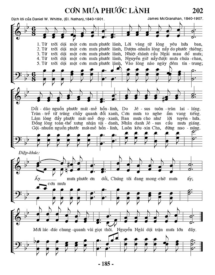 1. Từ trời dội một cơn mưa phước lành, Lời vàng từ lòng yêu hứa ban, Dồi - dào nguồn phước mát-mẻ hồn-linh, Do Jêsus tuôn tràn lai láng. 2. Từ trời dội một cơn mưa phước lành, Đượm nhuần lòng nầy do phước thiêng; Trần - trề từ trũng chảy quanh đồi xanh, Cơn mưa to nghe ầm vang tiếng. 3. Từ trời dội một cơn mưa phước lành, Nhiệt thành cầu Ngài mau đổ mưa; Làm lòng đầy phước mát-mẻ đẹp xanh, Ban mưa cho như lời tuyên hứa. 4. Từ trời dội một cơn mưa phước lành, Nguyễn giờ nầy được mưa chúa - chan, Đồng lòng toàn thể xưng nhận tội danh, Nhân danh Jê-sus cầu mưa giáng. 5. Từ trời dội một cơn mưa phước lành, Vào lòng nào ngày đêm tín - trung; Gội - nhuẫn nguồn phước mát-mẻ hồn - linh, Luôn kêu xin Cha, đừng nao - núng. Điệp khúc: Ấy cơn mưa phước ơn dồi, Chúng tôi đang mong chờ mưa ấy; Mới lác đác chung - quanh vài giọt thôi. Nguyễn Ngài dội trận mưa lớn đây.