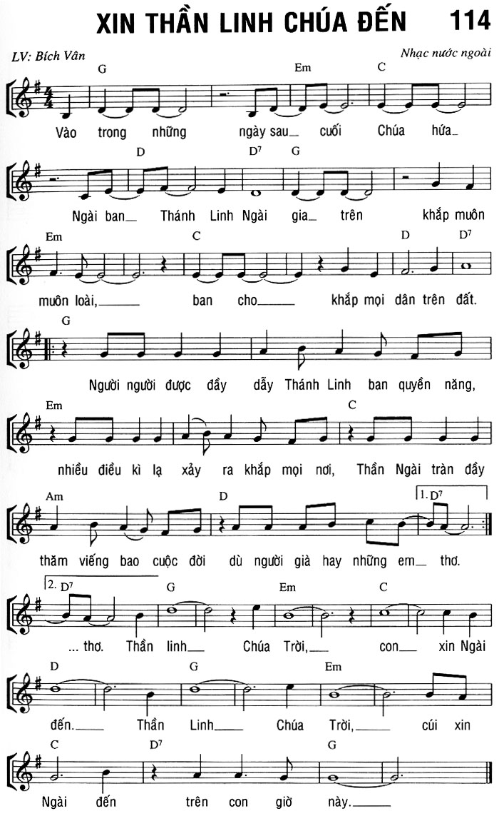 1. Vào trong những ngày sau cuối Chúa hứa Ngài ban Thánh Linh Ngài gia trên khắp muôn muôn loài, ban cho khắp mọi dân trên đất. Người người được đầy dẫy Thánh Linh ban quyền năng, nhiều điều kì lạ xảy ra khắp mọi nơi, Thần Ngài tràn đầy thăm viếng bao cuộc đời dù người già hay những em thơ. Thần linh Chúa Trời, con xin Ngài đến. 2. thơ. Thần Linh Chúa Trời, cúi xin Ngài đến trên con giờ này.