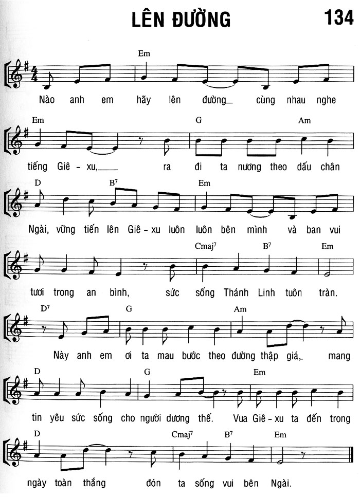 1. Nào anh em hãy lên đường cùng nhau nghe tiếng Giê-xu, ra đi ta nương theo dấu chân Ngài, vững tiến lên Giê-xu luôn luôn bên mình và ban vui tươi trong an bình, sức sống Thánh Linh tuôn tràn. Này anh em ơi ta mau bước theo đường thập giá, mang tin yêu sức sống cho người dương thế. Vua Giê-xu ta đến trong ngày toàn thắng đón ta sống vui bên Ngài.