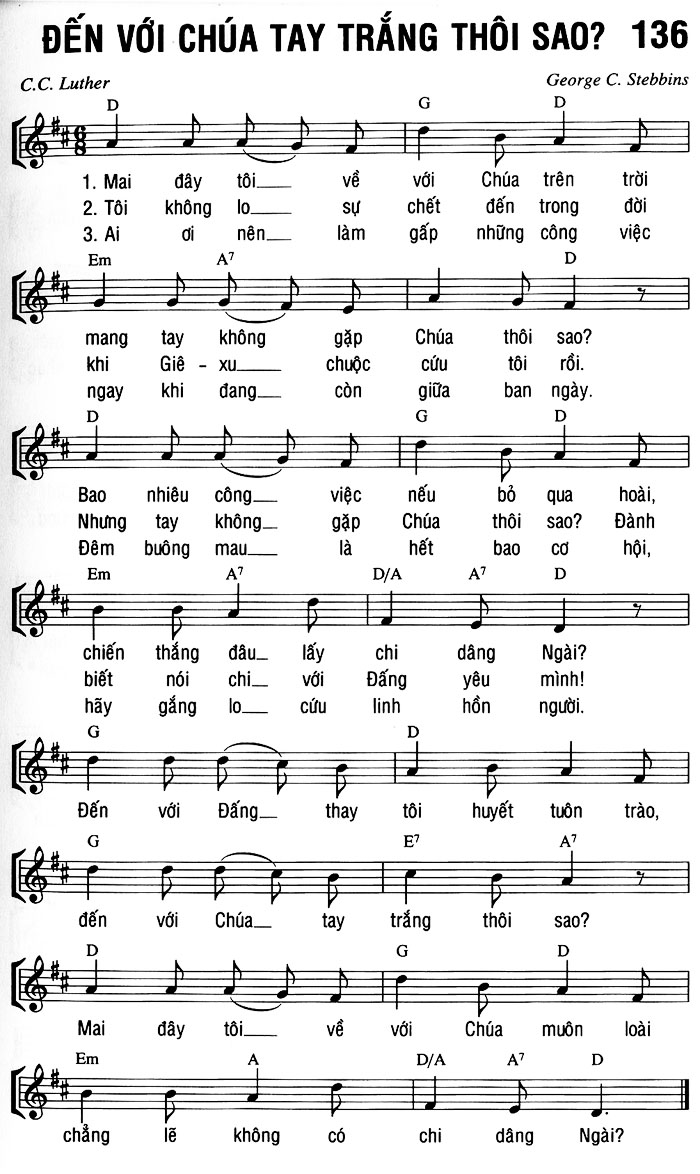 1. Mai đây tôi về với Chúa trên trời mang tay không gặp Chúa thôi sao? Bao nhiêu công việc nếu bỏ qua hoài, chiến thắng đâu lấy chi dâng Ngài? Đến với Đấng thay tôi huyết tuôn trào, đến với Chúa tay trắng thôi sao? Mai đây tôi về với Chúa muôn loài chẳng lẽ không có chi dâng Ngài? 2. Tôi không lo sự chết đến trong đời khi Giê-xu chuộc cứu tôi rồi. Nhưng tay không gặp Chúa thôi sao? Biết nói chi với Đấng yêu mình! Đến với Đấng thay tôi huyết tuôn trào, đến với Chúa tay trắng thôi sao? Mai đây tôi về với Chúa muôn loài chẳng lẽ không có chi dâng Ngài? 3. Ai ơi nên làm gấp những công việc ngay khi đang còn giữa ban ngày. Đêm buông mau là hết bao cơ hội, hãy gắng lo cứu linh hồn người. Đến với Đấng thay tôi huyết tuôn trào, đến với Chúa tay trắng thôi sao? Mai đây tôi về với Chúa muôn loài chẳng lẽ không có chi dâng Ngài?