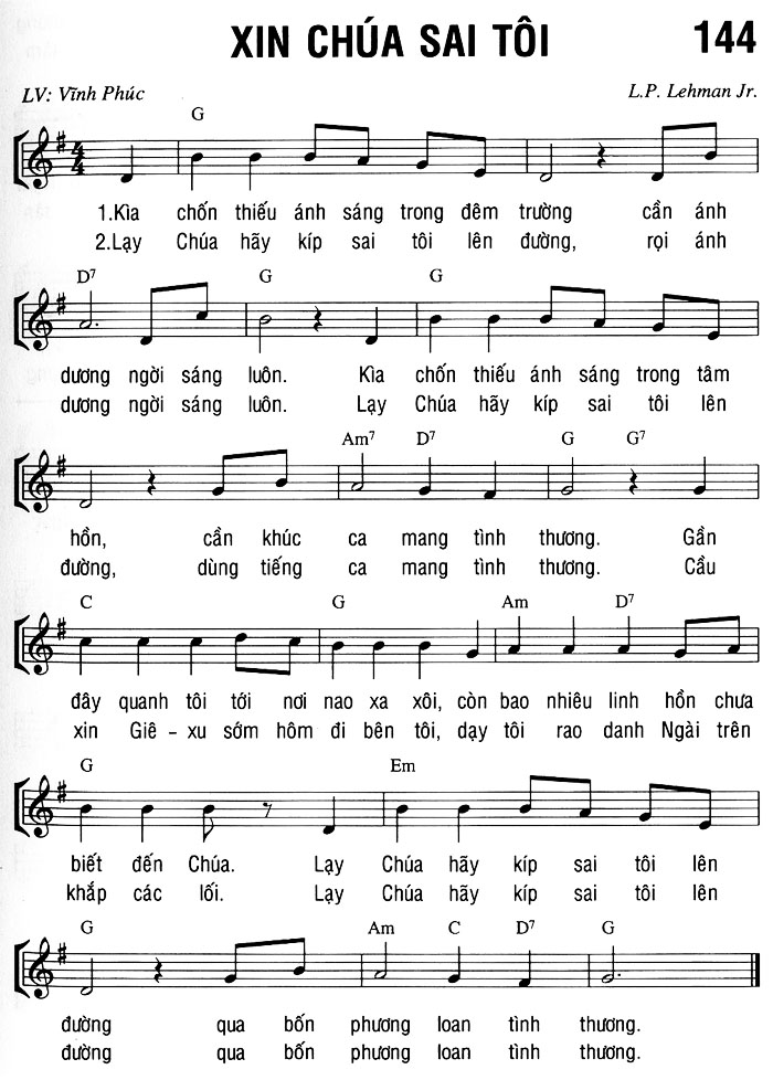 1. Kia chốn thiếu ánh sáng trong đêm trường cần ánh dương ngời sáng luôn. Kia chốn thiếu ánh sáng trong tâm hồn, cần khúc ca mang tình thương. Gần đây quanh tôi tới nơi nao xa xôi, còn bao nhiêu linh hồn chưa biết đến Chúa. Lạy Chúa hãy kíp sai tôi lên đường qua bốn phương loan tình thương. 2. Lạy Chúa hãy kíp sai tôi lên đường, rọi ánh dương ngời sáng luôn. Lạy Chúa hãy kíp sai tôi lên đường, dùng tiếng ca mang tình thương. Cầu xin Giê-xu sớm hôm đi bên tôi, dạy tôi rao danh Ngài trên khắp các lối. Lạy Chúa hãy kíp sai tôi lên đường qua bốn phương loan tình thương.