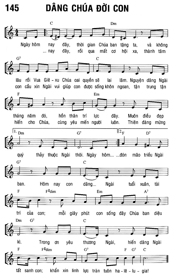1. Ngày hôm nay đây, thời gian Chúa ban tặng ta, và không lâu rồi Vua Giê-xu Chúa oai quyền sẽ lai lâm. Nguyện dâng Ngài tháng năm đó, hồn thân trí lực đây. Muôn điều đẹp quý thảy thuộc Ngài thôi. Ngày hôm nay con dâng Ngài tuổi xuân, tài trí của con; mỗi giây phút con sống đây Chúa ban diệu kì. Trong ơn yêu thương Ngài, hiến dâng Ngài tất sanh con; khẩn xin linh lực tràn tuôn ha – lê – lu – gia! 2. ... nay đây, rồi qua mất cơ hội xa, thành tâm con cầu xin Ngài vui giúp con được sống khôn ngoan, tận trung tận hiến cho Chúa, cùng yêu mến người luôn. Thiên đàng mừng đón mão triều Ngài ban. Trong ơn yêu thương Ngài, hiến dâng Ngài tất sanh con; khẩn xin linh lực tràn tuôn ha – lê – lu – gia!