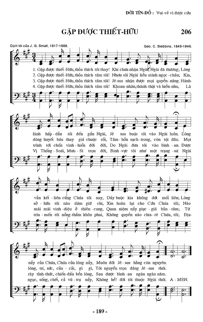 1. Gặp được thiết-Hữu, thỏa thích tôi thay! Khi chưa nhận Ngài, Ngài đà thương, Lòng lành hấp-dẫn tôi đến gần Ngài, Jê-sus buộc tôi vào Ngài luôn. Lòng vẫn kết-liên cùng Chúa tôi nay, Dây buộc kia không dứt mối liên; Lòng nầy của Chúa, Chúa của lòng nầy, Muôn đời Jê-sus hằng còn nguyên. 2. Gặp được thiết-Hữu, thỏa thích tâm tôi! Nhơn tôi Ngài liều mình ngọc-châu; Kìa, dòng huyết báu thay giá chuộc rồi, Tâm-hồn sạch-trong, còn tội đâu. Mọi sở-hữu tôi nào dám giữ chỉ, Xin hoàn lại cho Cứu Chúa tôi; Nào lòng, trí, sức, của cải, gì gì, Tôi nguyền trọn dâng Jê-sus thôi. 3. Gặp được thiết-Hữu, thỏa thích tâm tôi! Jê-sus nhận được mọi quyền năng. Hành-trình tới chốn vinh-hiển đời đời, Do Ngài đưa tôi vào bình-an. Được mãi mãi vinh-diệu ở thiên-cung, Quan niệm nầy giục-giã bản-tâm; Từ rày tỉnh thức, chiến đấu bền lòng, Sau được bình an ngàn ngàn năm. 4. Gặp được thiết-Hữu, thỏa thích tâm tôi! Khoan-nhân, thành-thật và hiền-nhu, Là Vị Thống-Soái, Mưu-Sĩ trọn đời, Binh-vực tôi như một trạng-sư. Ngài tríu-mến tôi nồng-thắm khôn phai, Không quyền nào chia-rẽ Chúa, tôi; Địa-ngục, sống, chết, cả vũ-trụ nầy, Không hề! đời tôi thuộc Ngài thôi. A-MEN.