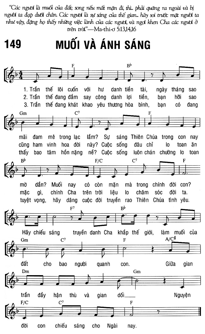 1. Trần thế lôi cuốn với hư danh tiền tài, ngày tháng sao mãi đam mê trong lạc lầm? Sự sáng Thiên Chúa trong con nay mờ dần? Muối nay có còn mặn mà trong chính đời con? 2. Trần thế đang đắm say công danh lợi tiền, bạn hồi sao cũng ham vinh hoa đời này? Cuộc sống đâu chỉ lo toan ăn mặc gì, chính Cha trên trời liệu lo chăm sóc đời ta. 3. Trần thế đang khát khao yêu thương hòa bình, bạn có đang thấy bao tâm hồn nặng nề? Cuộc sống luôn chán chường lo toan tuyệt vọng, hãy dâng cuộc đời truyền rao Thiên Chúa tình yêu. Điệp khúc: Hãy chiếu sáng truyền danh Cha khắp thế giới, làm muối của đất cho bao người quanh con. Giữa gian trần đầy hận thù và gian dối. Nguyện đời con chiếu sáng cho Ngài nay.