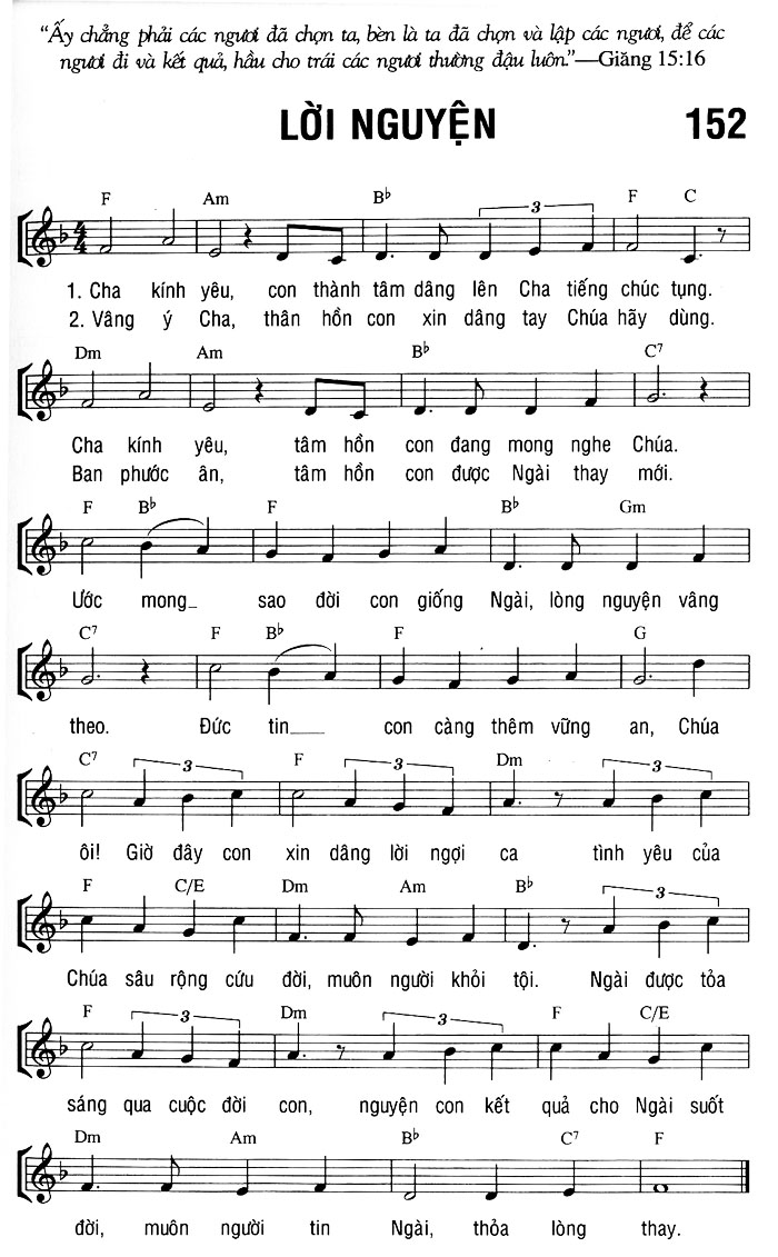 1. Cha kính yêu, con thành tâm dâng lên Cha tiếng chúc tụng. Cha kính yêu, tâm hồn con đang mong nghe Chúa. Ước mong sao đời con giống Ngài, lòng nguyện vâng theo. Đức tin con càng thêm vững an, Chúa ôi! Giờ đây con xin dâng lời ngợi ca tình yêu của Chúa sâu rộng cứu đời, muôn người khỏi tội. Ngài được tỏa sáng qua cuộc đời con, nguyện con kết quả cho Ngài suốt đời, muôn người tin Ngài, thỏa lòng thay. 2. Vâng ý Cha, thân hồn con xin dâng tay Chúa hãy dùng. Ban phước ân, tâm hồn con được Ngài thay mới. Ước mong sao đời con giống Ngài, lòng nguyện vâng theo. Đức tin con càng thêm vững an, Chúa ôi! Giờ đây con xin dâng lời ngợi ca tình yêu của Chúa sâu rộng cứu đời, muôn người khỏi tội. Ngài được tỏa sáng qua cuộc đời con, nguyện con kết quả cho Ngài suốt đời, muôn người tin Ngài, thỏa lòng thay.