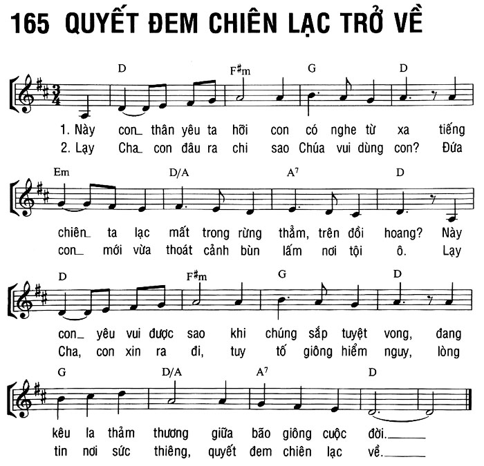 1. Này con thân yêu ta hỡi con có nghe từ xa tiếng chiên ta lạc mất trong rừng thẳm, trên đồi hoang? Này con yêu vui được sao khi chúng sắp tuyệt vọng, đang kêu la thảm thương giữa bão giông cuộc đời. 2. Lạy Cha con đâu ra chi sao Chúa vui dùng con? Đứa con mới vừa thoát cảnh bùn lấm nơi tội ô. Lạy Cha, con xin ra đi, tuy tố giông hiểm nguy, lòng tin nơi sức thiêng, quyết đem chiên lạc về.