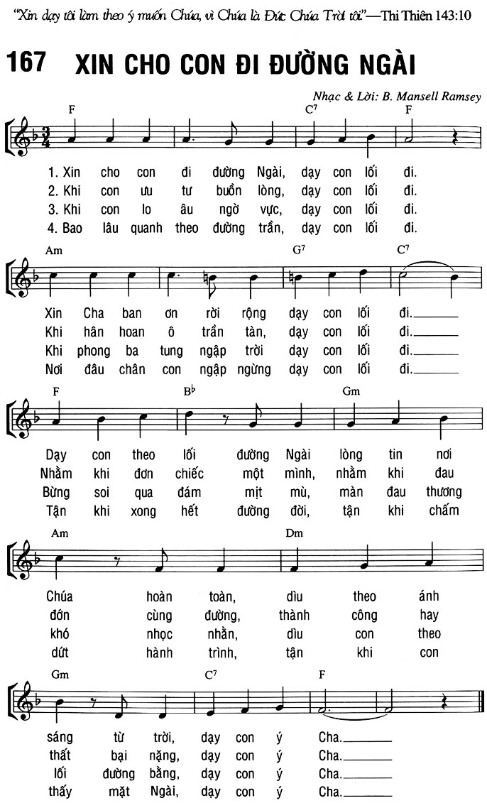 1. Xin cho con đi đường Ngài, dạy con lối đi. Xin Cha ban ơn rời rộng dạy con lối đi. Dạy con theo lối đường Ngài lòng tin nơi Chúa hoàn toàn, dìu theo ánh sáng từ trời, dạy con ý Cha. 2. Khi con ưu tư buồn lòng, dạy con lối đi. Khi hân hoan ô trần tàn, dạy con lối đi. Nhằm khi đơn chiếc một mình, nhằm khi đau đớn cùng đường, thành công hay thất bại nặng, dạy con ý Cha. 3. Khi con lo âu ngờ vực, dạy con lối đi. Khi phong ba tung ngập trời dạy con lối đi. Bừng soi qua đám mịt mù, màn đau thương khó nhọc nhằn, dìu con theo lối đường bằng, dạy con ý Cha. 4. Bao lâu quanh theo đường trần, dạy con lối đi. Nơi đâu chân con ngập ngừng dạy con lối đi. Tận khi xong hết đường đời, tận khi chấm dứt hành trình, tận khi con thấy mặt Ngài, dạy con ý Cha.
