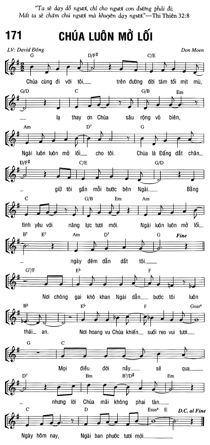 1. Chúa cùng đi với tôi, trên đường đời tăm tối mịt mù, lạ thay ơn Chúa sâu rộng vô biên, Ngài luôn luôn mở lối cho tôi. Chúa là Đấng dắt chăn, giữ tôi gần mỗi bước bên Ngài. Bằng tình yêu với năng lực tươi mới. Ngài luôn luôn mở lối, ngày đêm dẫn dắt tôi. Nơi chông gai khô khan Ngài dẫn bước tôi luôn thái an. Nơi hoang vu Chúa khiến suối reo vui tươi. Mọi điều đời nầy sẽ qua, nhưng lời Chúa mãi không phai tàn. Ngày hôm nay, Ngài ban phước tươi mới.