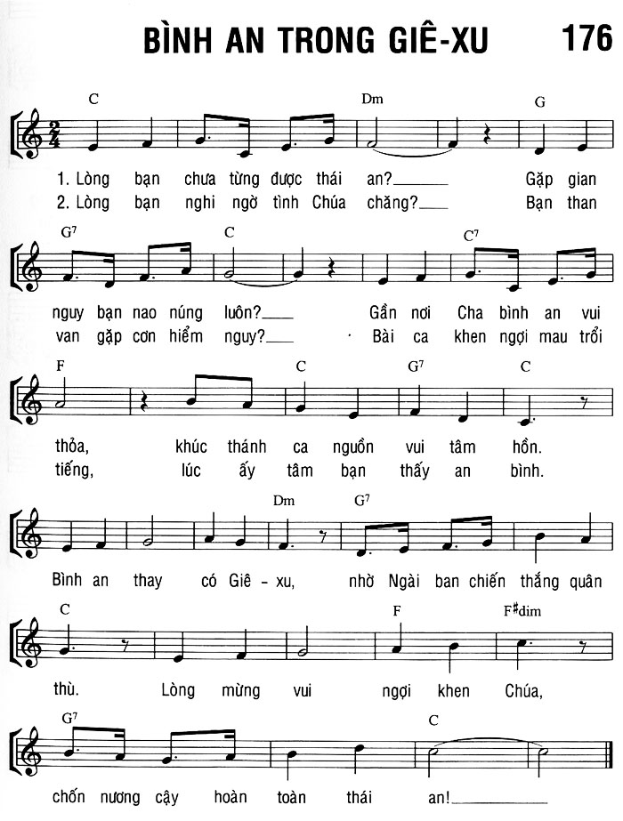 1. Lòng bạn chưa từng được thái an? Gặp gian nguy bạn nao núng luôn? Gần nơi Cha bình an vui thỏa, khúc thánh ca nguồn vui tâm hồn. 2. Lòng bạn nghi ngờ tình Chúa chăng? Bạn than van gặp cơn hiểm nguy? Bài ca khen ngợi mau trổi tiếng, lúc ấy tâm bạn thấy an bình. Điệp khúc: Bình an thay có Giê-xu, nhờ Ngài ban chiến thắng quân thù. Lòng mừng vui ngợi khen Chúa, chốn nương cậy hoàn toàn thái an!