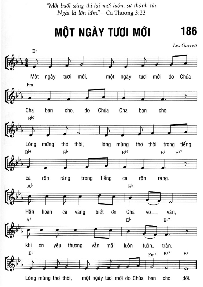 Điệp khúc: Một ngày tươi mới, một ngày tươi mới do Chúa Cha ban cho. Lòng mừng thơ thới, lòng mừng thơ thới trong tiếng ca rộn ràng. Hân hoan ca vang biết ơn Cha vô vàn, khi ơn yêu thương vẫn mãi luôn tuôn tràn. Lòng mừng thơ thới, một ngày tươi mới do Chúa ban cho đời.