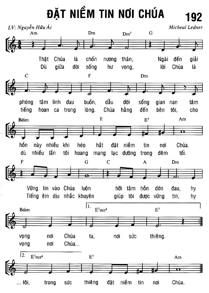 1. Thật Chúa là chốn nương thân, Ngài đến giải phóng tâm linh đau buồn, dẫu đời sống gian nan tâm hồn này nhiều khi héo hắt đặt niềm tin nơi Chúa. Vững tin vào Chúa luôn hỡi tâm hồn đớn đau, hy vọng nơi Chúa ta, nơi sức thiêng. 2. Dù giữa đời sống hư vong, lời Chúa là tiếng hoan ca trong lòng. Chúa hằng đến bên tôi, cho dù nhiều lần tôi hoang mang lạc đường trong đêm tối. Tiếng êm dịu nhắc khuyên giúp tôi được vững tin, hy vọng nơi Chúa... tôi, trong sức thiêng đặt niềm tin nơi Chúa.