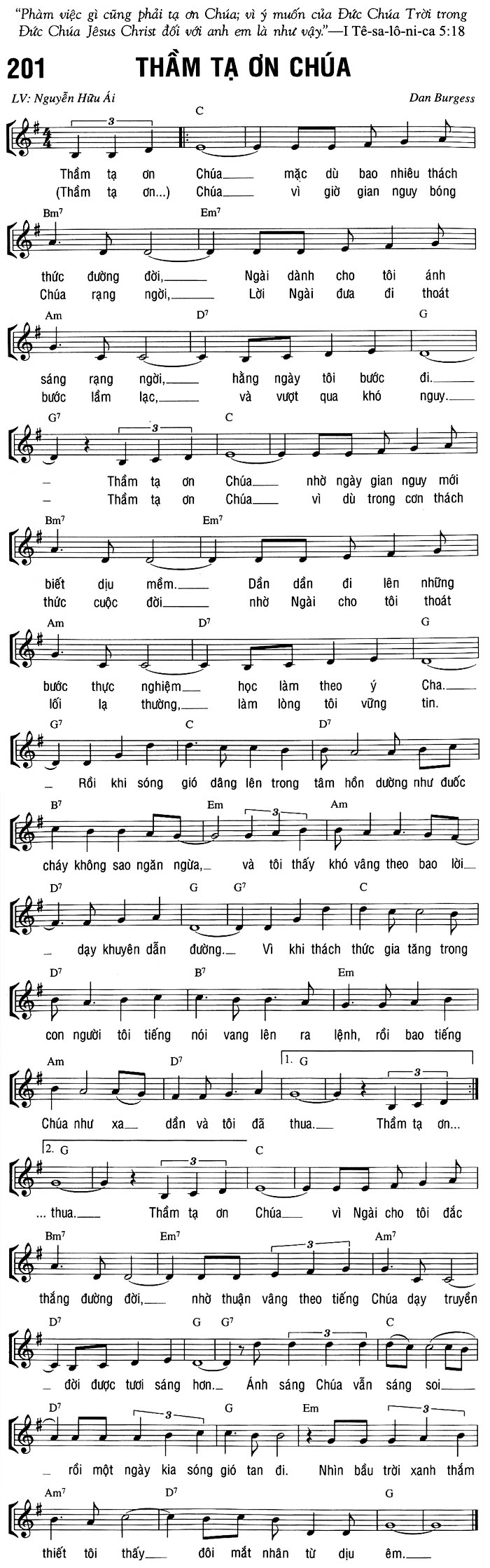1. Thầm tạ ơn Chúa mặc dù bao nhiêu thách thức đường đời, Ngài dành cho tôi ánh sáng rạng ngời, hằng ngày tôi bước đi. Thầm tạ ơn Chúa nhờ ngày gian nguy mới biết dịu mềm. Dần dần đi lên những bước thực nghiệm, học làm theo ý Cha. Rồi khi sóng gió dâng lên trong tâm hồn dường như đuốc cháy không sao ngăn ngừa, và tôi thấy khó vâng theo bao lời dạy khuyên dẫn đường. Vì khi thách thức gia tăng trong con người tôi tiếng nói vang lên ra lệnh, rồi bao tiếng Chúa như xa dần và tôi đã thua. 2. Thầm tạ ơn Chúa vì giờ gian nguy bóng Chúa rạng ngời, Lời Ngài đưa đi thoát lạc, và vượt qua khó nguy. Thầm tạ ơn Chúa vì dù trong cơn thách thức cuộc đời. Nhờ Ngài cho tôi thoát lối lạ thường, làm lòng tôi vững tin. Rồi khi sóng gió dâng lên trong tâm hồn dường như đuốc cháy không sao ngăn ngừa, và tôi thấy khó vâng theo bao lời dạy khuyên dẫn đường. Vì khi thách thức gia tăng trong con người tôi tiếng nói vang lên ra lệnh, rồi bao tiếng Chúa như xa dần và tôi đã thua. Thầm tạ ơn Chúa vì Ngài cho tôi đắc thắng đường đời, nhờ thuận vâng theo tiếng Chúa dạy truyền đời được tươi sáng hơn. Ánh sáng Chúa vẫn sáng soi rồi một ngày kia sóng gió tan đi. Nhìn bầu trời xanh thắm thiết tôi thấy đôi mắt nhân từ dịu êm.