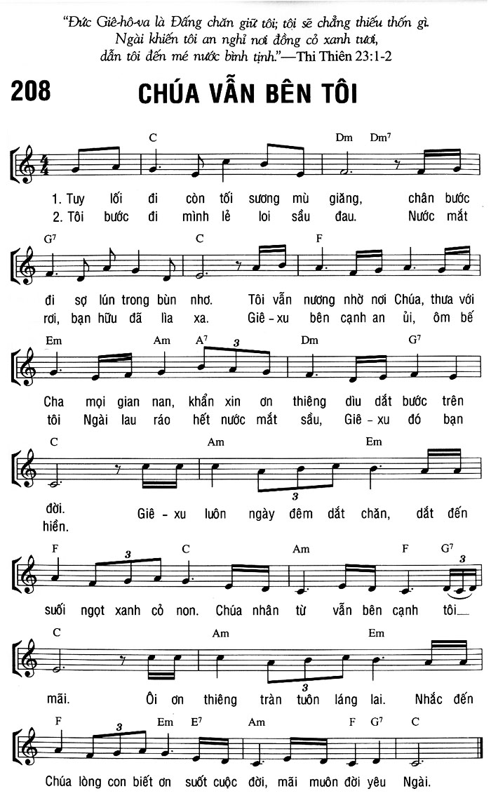 1. Tuy lối đi còn tối sương mù giăng, chân bước đi sợ lún trong bùn nhơ. Cha mọi gian nan, khẩn xin ơn thiêng dìu dắt bước trên đời. Giê-xu luôn ngày đêm dắt chăn, dắt đến suối ngọt xanh cỏ non. Chúa nhân từ vẫn bên cạnh tôi mãi. 2. Tôi bước đi mình lẻ loi sầu đau. Nước mắt rơi, bạn hữu đã lìa xa. Tôi vẫn nương nhờ nơi Chúa, thưa với Ngài lau ráo hết nước mắt sầu, Giê-xu đó bạn hiền. Ôi ơn thiêng tràn tuôn láng lai. Nhắc đến Chúa lòng con biết ơn suốt cuộc đời, mãi muôn đời yêu Ngài.