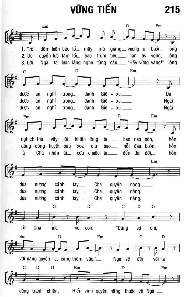 1. Trời đêm luôn bão tố mây mù giăng vương u buồn, lòng được an nghỉ trong danh Giê-xu. Dù nghịch thù vây lối khiến lòng ta bao nao sờn, hồn dựa nương cánh tay Cha quyền năng. Lời Cha hứa với con: "Đừng sợ chi, với năng quyền Ta càng thêm sức." Ngài sẽ đến với ta cùng tranh chiến. Hiển vinh quyền năng thuộc về Ngài. 2. Dù quyền lực tăm tối bao trùm tiêu tan hy vọng, lòng được an nghỉ trong danh Giê-xu. Ngài dùng dòng huyết báu xoa dịu bao nỗi đau buồn, hồn dựa nương cánh tay Cha quyền năng. Lời Cha hứa với con: "Đừng sợ chi, với năng quyền Ta càng thêm sức." Ngài sẽ đến với ta cùng tranh chiến. Hiển vinh quyền năng thuộc về Ngài. 3. Lời Ngài ta luôn lắng nghe từng câu "Hãy vững vàng!" lòng được an nghỉ trong danh Giê-xu. Ngài là Cha nhân ái cứu chuộc ta đến đời đời, hồn dựa nương cánh tay Cha quyền năng. Lời Cha hứa với con: "Đừng sợ chi, với năng quyền Ta càng thêm sức." Ngài sẽ đến với ta cùng tranh chiến. Hiển vinh quyền năng thuộc về Ngài.