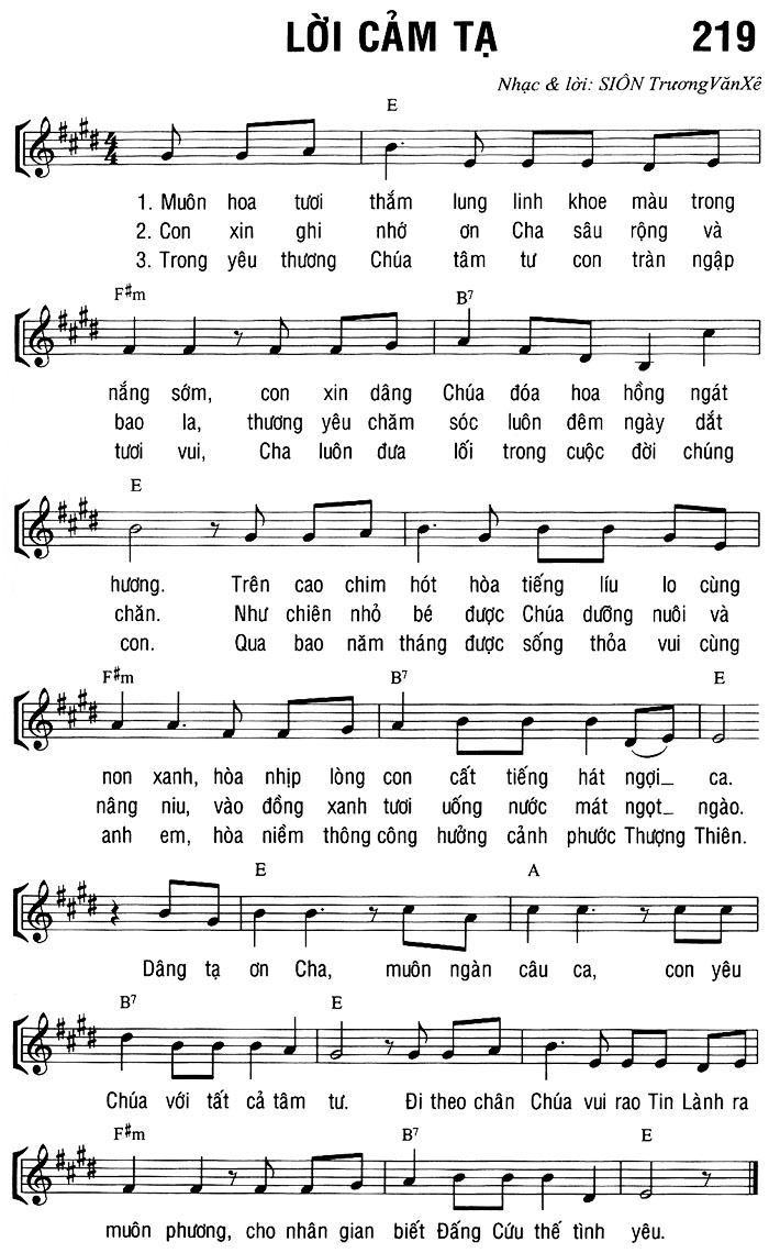 1. Muôn hoa tươi thắm lung linh khoe màu trong nắng sớm, con xin dâng Chúa đóa hoa hồng ngát hương. Trên cao chim hót hòa tiếng líu lo cùng non xanh, hòa nhịp lòng con cất tiếng hát ngợi ca. 2. Con xin ghi nhớ ơn Cha sâu rộng và bao la, thương yêu chăm sóc luôn đêm ngày dắt chăn. Như chiên nhỏ bé được Chúa dưỡng nuôi và nâng niu, vào đồng xanh tươi uống nước mát ngọt ngào. 3. Trong yêu thương Chúa tâm tư con tràn ngập tươi vui, Cha luôn đưa lối trong cuộc đời chúng con. Qua bao năm tháng được sống thỏa vui cùng anh em, hòa niềm thông công hưởng cảnh phước Thượng Thiên. Điệp khúc: Dâng tạ ơn Cha, muôn ngàn câu ca, con yêu Chúa với tất cả tâm tư. Đi theo chân Chúa vui rao Tin Lành ra muôn phương, cho nhân gian biết Đấng Cứu thế tình yêu.