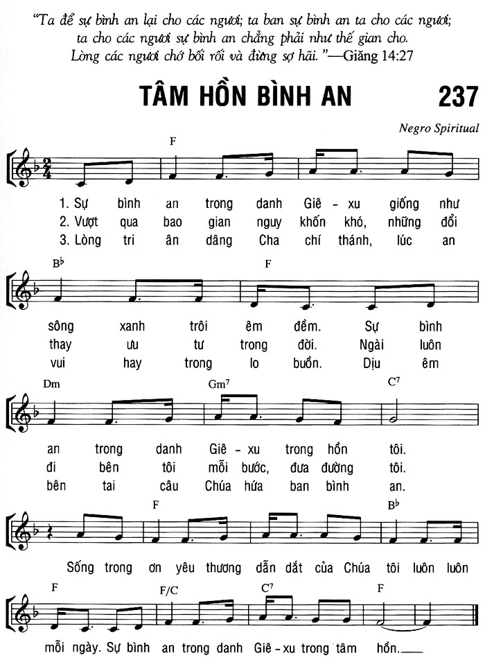1. Sự bình an trong danh Giê-xu giống như sông xanh trôi êm đềm. Sự bình an trong danh Giê-xu trong hồn tôi. Sống trong ơn yêu thương dẫn dắt của Chúa tôi luôn luôn mỗi ngày. Sự bình an trong danh Giê-xu trong tâm hồn. 2. Vượt qua bao gian nguy khốn khó, những đổi thay ưu tư trong đời. Ngài luôn đi bên tôi mỗi bước, đưa đường tôi. Sống trong ơn yêu thương dẫn dắt của Chúa tôi luôn luôn mỗi ngày. Sự bình an trong danh Giê-xu trong tâm hồn. 3. Lòng tri ân dâng Cha chí thánh, lúc an vui hay trong lo buồn. Dịu êm bên tai câu Chúa hứa ban bình an. Sống trong ơn yêu thương dẫn dắt của Chúa tôi luôn luôn mỗi ngày. Sự bình an trong danh Giê-xu trong tâm hồn.