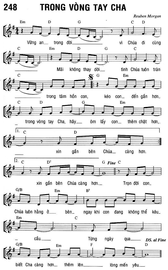 1. Vững an trong đời vì Chúa đi cùng. Mãi không thay dời tình Chúa tuôn tràn trong tâm hồn con, kéo con đến gần hơn. trong vòng tay Cha, hãy ôm lấy con thêm chặt hơn, xin gần bên Chúa càng hơn. 2. Trọn đời con Chúa luôn hằng ở bên ngay khi con đang không thể kêu cầu. Từng ngày qua biết Cha càng hơn thêm lên lòng mến yêu.