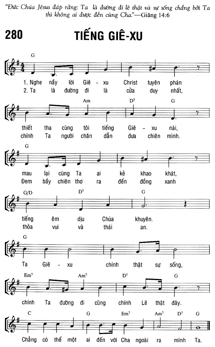 1. Nghe nầy lời Giê-xu Christ tuyên phán duy nhất, thiết tha cùng tôi tiếng Giê-xu nài, mau lại cùng Ta ai kẻ khao khát, tiếng êm dịu Chúa khuyên. Ta Giê-xu chính thật sự sống, chính Ta đường đi cũng chính Lẽ thật đây. Chẳng có thể một ai đến với Cha ngoài ra mình Ta. 2. Ta là đường đi là cửa duy nhất, chính Ta người chăn dẫn đưa chiên mình. Đem bầy chiên thơ ra đến đồng xanh thỏa vui và thái an. Ta Giê-xu chính thật sự sống, chính Ta đường đi cũng chính Lẽ thật đây. Chẳng có thể một ai đến với Cha ngoài ra mình Ta.