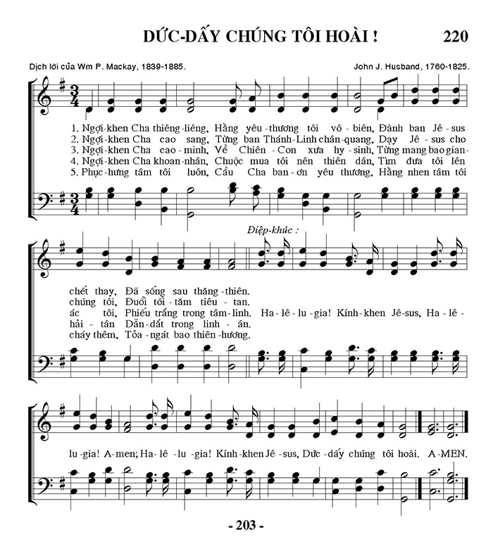1. Ngợi khen Cha thiêng liêng, Hằng yêu thương tôi vô biên, Đành ban Jê-sus chết thay, Đã sống sau thăng - thiên. 2. Ngợi khen Cha cao sang, Từng ban Thánh Linh chân quang, Dạy Jê-sus cho chúng tôi, Đuổi tối - tăm tiêu tan. 3. Ngợi khen Cha cao minh, Về Chiến - Con xưa hy sinh, Từng mang bao gian ác tôi, Phiếu trắng trong tâm linh. 4. Ngợi khen Cha khoan nhân, Chuộc mua tôi nên thiên dân, Tìm đưa tôi lên hải tân Dẫn dắt trong linh ân. 5. Phục hưng tâm tôi luôn, Cầu Cha ban ơn yêu thương, Hằng nhen tâm tôi cháy thêm, Tỏa ngát bao thiên hương. Điệp khúc: Ha-lê-lu-gia! Kính-khen Jê-sus, Ha-lê-lu-gia! A-men; Ha-lê-lu-gia! Kính-khen Jê-sus, Dức-dấy chúng tôi hoài. A-MEN.