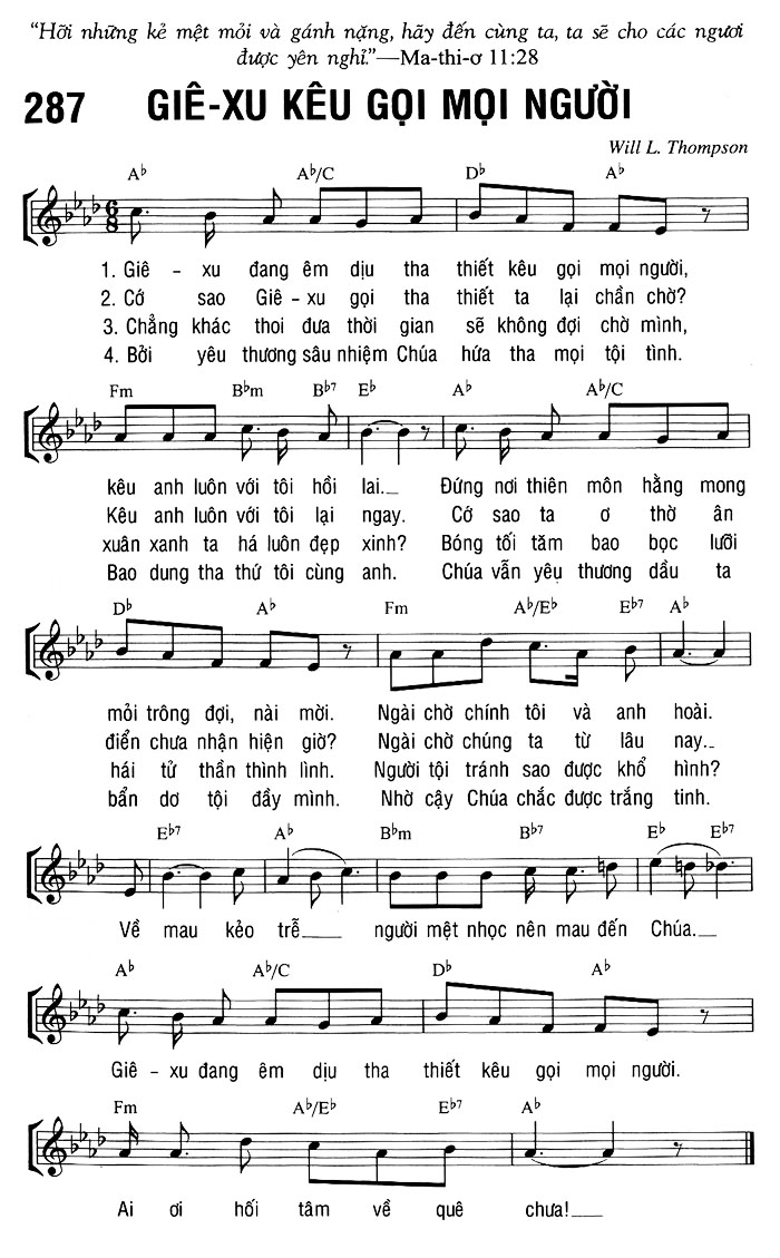 1. Giê-xu đang êm dịu tha thiết kêu gọi mọi người, kêu anh luôn với tôi hồi lai._ mỏi trông đợi, nài mời. Về mau kẻo trễ người mệt nhọc nên mau đến Chúa. Giê-xu đang êm dịu tha thiết kêu gọi mọi người. Ai ơi hối tâm về quê Chúa! 2. Cớ sao Giê-xu gọi tha thiết ta lại chần chờ? Kêu anh luôn với tôi lại ngay. điển chưa nhận hiện giờ? Về mau kẻo trễ người mệt nhọc nên mau đến Chúa. Giê-xu đang êm dịu tha thiết kêu gọi mọi người. Ai ơi hối tâm về quê Chúa! 3. Chẳng khác thoi đưa thời gian sẽ không đợi chờ mình, xuân xanh ta há luôn đẹp xinh? hái tử thần thình lình. Về mau kẻo trễ người mệt nhọc nên mau đến Chúa. Giê-xu đang êm dịu tha thiết kêu gọi mọi người. Ai ơi hối tâm về quê Chúa! 4. Bởi yêu thương sâu nhiệm Chúa hứa tha mọi tội tình. Bao dung tha thứ tôi cùng anh. bẩn dơ tội đầy mình. Về mau kẻo trễ người mệt nhọc nên mau đến Chúa. Giê-xu đang êm dịu tha thiết kêu gọi mọi người. Ai ơi hối tâm về quê Chúa!