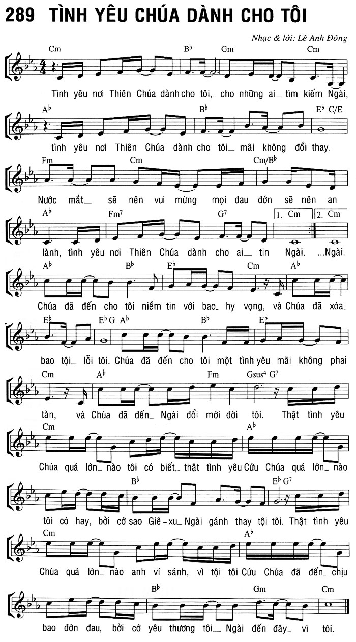 1. Tình yêu nơi Thiên Chúa dành cho tôi, cho những ai tìm kiếm Ngài, tình yêu nơi Thiên Chúa dành cho tôi mãi không đổi thay. Nước mắt sẽ nên vui mừng mọi đau đớn sẽ nên an lành, tình yêu nơi Thiên Chúa dành cho ai tin Ngài. Ngài. 2. Chúa đã đến cho tôi niềm tin với bao hy vọng, và Chúa đã xóa bao tội lỗi tôi. Chúa đã đến cho tôi một tình yêu mãi không phai tàn, và Chúa đã đến Ngài đổi mới đời tôi. Thật tình yêu Chúa quá lớn nào tôi có biết, thật tình yêu Cứu Chúa quá lớn nào tôi có hay, bởi cớ sao Giê-xu Ngài gánh thay tội tôi. 3. Thật tình yêu Chúa quá lớn nào anh ví sánh, vì tội tôi Cứu Chúa đã đến chịu bao đớn đau, bởi cớ yêu thương tôi Ngài đến đây vì tôi.