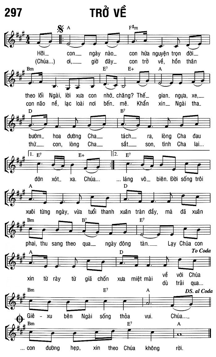1. Hồi con ngày nào con hứa nguyện trọn đời theo lối Ngài, lời xưa con nhớ chăng? Thế gian ngựa, xe, bướm hoa đường Cha tách ra, lòng Cha đau đớn xót xa. Chúa... láng vô biên. Đời sống trôi xuôi từng ngày, vừa tuổi thanh xuân tràn đầy, mà đã xuân phai, thu sang theo qua ngày đông tàn. Lạy Chúa con xin từ rày từ giã chốn xưa miệt mài về với Chúa Giê-xu bên Ngài sống thỏa vui. 2. (Chúa...) ơi, giờ đây con trở về, hồn thân con não nề, lạc loài nơi bến mê. Khẩn xin Ngài tha thứ con, lòng Cha sắt son, tình Cha lai... Chúa... con đường hẹp, xin theo Chúa không rời.