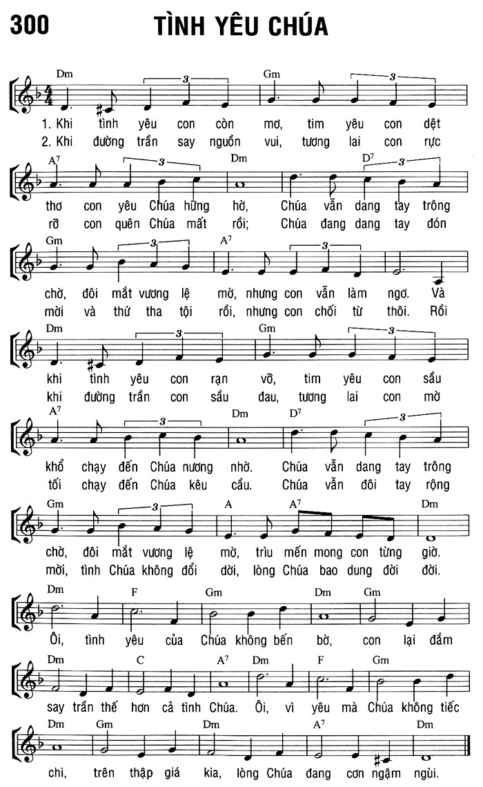 1. Khi tình yêu con còn mờ, tim yêu con dệt thơ con yêu Chúa hững hờ, Chúa vẫn dang tay trông chờ, đôi mắt vương lệ mờ, nhưng con vẫn làm ngơ. Và khi tình yêu con rạn vỡ, tim yêu con sầu khổ chạy đến Chúa nương nhờ. Chúa vẫn dang tay trông chờ, đôi mắt vương lệ mờ, trìu mến mong con từng giờ. 2. Khi đường trần say nguồn vui, tương lai con rực rõ con quên Chúa mất rồi; Chúa đang dang tay đón mời và thứ tha tội rồi, nhưng con chối từ thôi. Rồi khi đường trần con sầu đau, tương lai con mờ tối chạy đến Chúa kêu cầu. Chúa vẫn đôi tay rộng mời, tình Chúa không đổi dời, lòng Chúa bao dung đời đời. Điệp khúc: Ôi, tình yêu của Chúa không bến bờ, con lại đắm say trần thế hơn cả tình Chúa. Ôi, vì yêu mà Chúa không tiếc chi, trên thập giá kia, lòng Chúa đang cơn ngậm ngùi.