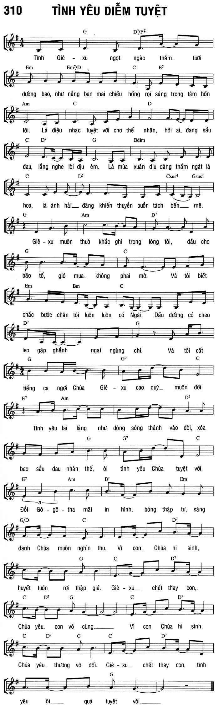 1. Tình Giê-xu ngọt ngào thắm tươi dường bao, như nắng ban mai chiếu hồng rọi sáng trong tâm hồn tôi. Là điệu nhạc tuyệt vời cho thế nhân, hồi ai đang sầu đau, lắng nghe lời dịu êm. Là mùa xuân dịu dàng thắm ngát lá hoa, là ánh hải đăng khiến thuyền buồn tách bến mê. Giê-xu muôn thuở khắc ghi trong lòng tôi, dầu cho bão tố, gió mưa không phai mờ. Và tôi biết chắc bước chân tôi luôn luôn có Ngài. Dầu đường có cheo leo gập ghềnh ngại ngùng chi. Và tôi cất tiếng ca ngợi Chúa Giê-xu cao quý muôn đời. 2. Tình yêu lai láng như dòng sông thánh vào đời, xóa bao sầu đau nhân thế, ôi tình yêu Chúa tuyệt vời, Đồi Gô-gô-tha mãi in hình bóng thập tự, sáng danh Chúa muôn nghìn thu. Vì con Chúa hi sinh, huyết tuôn rơi thập giá. Giê-xu chết thay con, Chúa yêu con vô cùng. Vì con Chúa hi sinh, huyết tuôn rơi thập giá. Giê-xu chết thay con, Chúa yêu thương vô đối. 3. Giê-xu chết thay con, tình yêu ôi quá tuyệt vời.