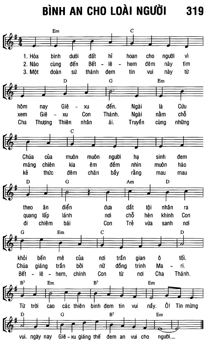 1. Hòa bình dưới đất hỉ hoan cho người vì hôm nay Giê-xu đến. Ngài là Cứu Chúa của muôn muôn người hạ sinh đem khỏi bến mê của nơi trần gian ô tối. 2. Nào cùng đến Bết-lê-hem đêm này tìm xem Giê-xu Con Thánh. Ngài nằm chỗ máng chiên kia êm đềm nhìn muôn hào quang lấp lánh nơi chỗ hèn khinh Con Chúa giáng trần bởi nữ đồng trinh Ma-ri. 3. Một đoàn sứ thánh đem tin vui này từ Cha Thượng Thiên nhân ái. Truyền cùng những kẻ thức đêm chăn bầy rằng mau mau đi chiêm bái Con Trẻ vừa sanh nơi Bết-lê-hem, chính Con từ nơi Cha Thánh. Điệp khúc: Từ trời cao các thiên binh đem tin vui nầy. Ô! Tin mừng vui, ngày nay Giê-xu giáng thế đem an vui cho người.
