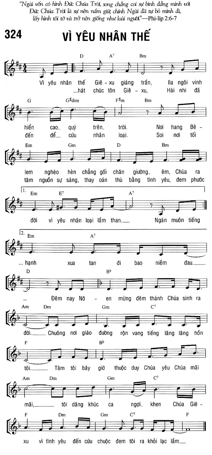 1. Vì yêu nhân thế Giê-xu giáng trần, lìa ngôi vinh hiển cao quý trên trời. Nơi hang Bê-lem nghèo hèn chẳng gối chăn giường êm, Chúa ra đời vì yêu nhân loại lầm than. Ngàn muôn tiếng tôi dâng khúc ca ngợi khen Chúa Giê-xu vì tình yêu đến cứu chuộc đem tôi ra khỏi lạc lầm. 2. ...hát chúc tôn Giê-xu, Hài nhi đã đến để cứu nhân loại. Soi nơi tối tăm nguồn sự sáng, thay oán thù bằng tình yêu, đem phước ...hạnh xua tan đi bao niềm đau. Đêm nay Nô-en mừng đêm thánh Chúa sinh ra đời. Chuông nơi giáo đường rộn vang tiếng lâng lâng hồn tôi. Tâm tôi bây giờ thuộc duy Chúa yêu Chúa mãi mãi, tôi dâng khúc ca ngợi khen Chúa Giê-xu vì tình yêu đến cứu chuộc đem tôi ra khỏi lạc lầm.