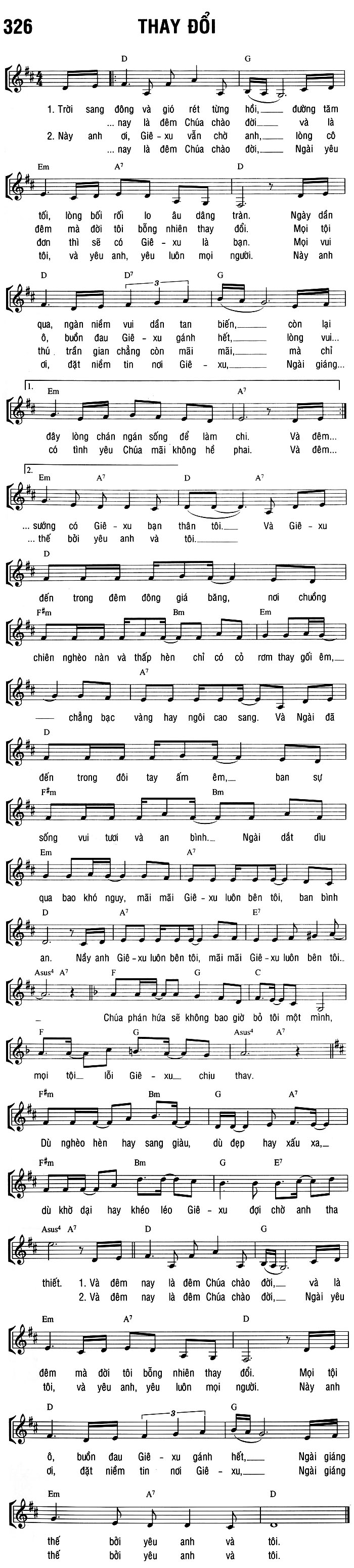 1. Trời sang đông và gió rét từng hồi, đường tăm tối, lòng bối rối lo âu dâng tràn. Ngày dần qua, ngàn niềm vui dần tan biến, còn lại đây lòng chán ngán sống để làm chi. Và đêm nay là đêm Chúa chào đời, đêm mà đời tôi bỗng nhiên thay đổi. Ô, buồn đau Giê-xu gánh hết, Ngài giáng thế bởi yêu anh và tôi. 2. Này anh ơi, Giê-xu vẫn chờ anh, lòng cô đơn thì sẽ có Giê-xu là bạn. Mọi vui thú trần gian chẳng còn mãi mãi, mà chỉ có tình yêu Chúa mãi không hề phai. Và đêm nay là đêm Chúa chào đời, Ngài yêu tôi, và yêu anh, yêu luôn mọi người. Này anh ơi, đặt niềm tin nơi Giê-xu, Ngài giáng thế bởi yêu anh và tôi. Bridge: Sướng có Giê-xu ban thân tôi. Và Giê-xu đến trong đêm đông giá băng, nơi chuồng chiên nghèo nàn và thấp hèn chỉ có cỏ rơm thay gối êm, chẳng bạc vàng hay ngôi cao sang. Và Ngài đã đến trong đôi tay ấm êm, ban sự sống vui tươi và an bình. Ngài dắt dìu qua bao khó nguy, mãi mãi Giê-xu luôn bên tôi, ban bình an. Này anh Giê-xu luôn bên tôi, mãi mãi Giê-xu luôn bên tôi. Chúa phán hứa sẽ không bao giờ bỏ tôi một mình, mọi tội lỗi Giê-xu chịu thay. Dù nghèo hèn hay sang giàu, dù đẹp hay xấu xa, dù khờ dại hay khéo léo Giê-xu đợi chờ anh tha thiết.