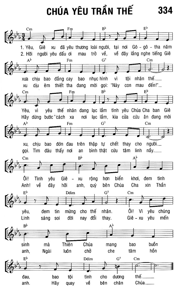 1. Yêu, Giê-xu đã yêu thương loài người, tại nơi Gô-gô-tha năm xưa chịu bao đắng cay bao nhục hình vì tội nhân thế. Yêu, vì yêu thế nhân đang lạc lầm tình yêu Chúa Cha ban Giê-xu, chịu bao đớn đau trên thập tự chết thay cho người. Ôi! Tình yêu Giê-xu rộng hơn biển khơi, đem tình yêu, đem tin mừng cho thế nhân. Ôi! Vì yêu chúng sinh mà Thiên Chúa mang bao buồn đau, bao tội tình cho dương thế. 2. Hỡi người yêu dấu ơi mau trở về, về đây lắng nghe tiếng Giê-xu dịu êm thiết tha đang mời gọi: "Này con mau đến!" Hãy dừng bước cách xa nơi lạc lầm, kìa cửa cứu ân đang mời gọi. Tìm đâu thấy nơi an bình thật cứu tâm linh nầy. Anh! về đây hỡi anh, quỳ bên Chúa Cha xin Thần Linh sáng soi đời nay đổi thay. Giê-xu yêu mến anh, Ngài luôn chở che tâm hồn anh. Hãy quay về bên chân Chúa.