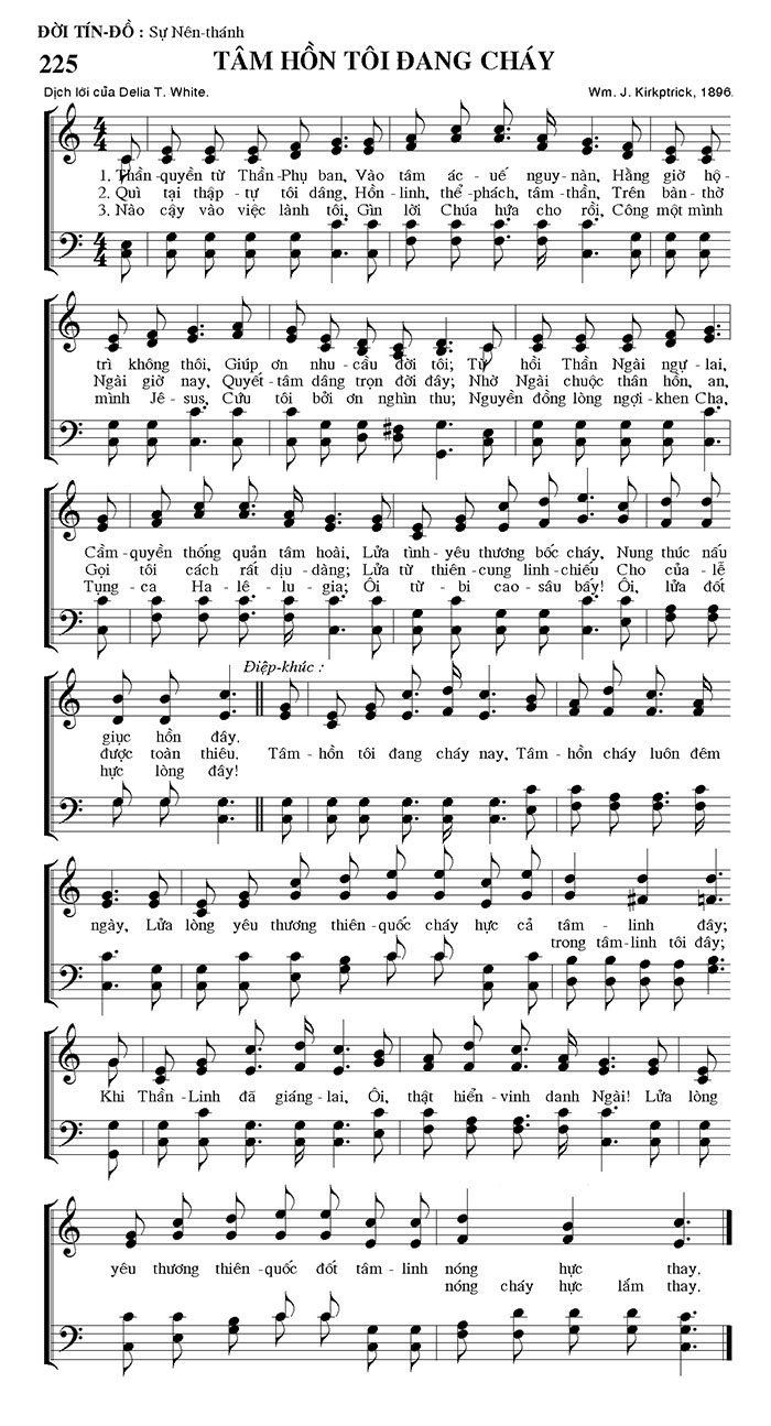 1. Thần quyền từ Thần Phụ ban, Vào tâm ác uế nguy nàn, Hằng giờ hộ trì không thôi, Giúp ơn nhu cầu đời tôi; Từ hồi Thần Ngài ngự lai, Cầm quyền thống quản tâm hoài, Lửa tình yêu thương bốc cháy, Nung thúc nấu giục hồn đây. 2. Quì tại thập tự tôi dâng, Hồn linh, thể phách, tâm thần, Trên bàn thờ Ngài giờ nay, Quyết tâm dâng trọn đời đây; Nhờ Ngài chuộc thân hồn, an, Gọi tôi cách rất dịu dàng; Lửa từ thiên cung linh chiếu Cho của lễ được toàn thiêu. 3. Nào cậy vào việc lành tôi, Gìn lời Chúa hứa cho rồi, Công một mình mình Jêsus, Cứu tôi bởi ơn nghìn thu; Nguyễn đồng lòng ngợi khen Cha, Tụng ca Ha lê lu gia; Ôi từ bi cao sâu bấy! Ôi, lửa đốt hực lòng đây! chorus. Tâm hồn tôi đang cháy nay, Tâm hồn cháy luôn đêm ngày, Lửa lòng yêu thương thiên quốc cháy hực cả tâm linh đây; trong tâm linh tôi đây; Khi Thần Linh đã giáng lai, Ôi, thật hiển vinh danh Ngài! Lửa lòng yêu thương thiên quốc đốt tâm linh nóng hực nóng cháy hực lắm thay. Điệp khúc: Tâm hồn tôi đang cháy nay, Tâm hồn cháy luôn đêm ngày, Lửa lòng yêu thương thiên quốc cháy hực cả tâm linh đây; trong tâm linh tôi đây; Khi Thần Linh đã giáng lai, Ôi, thật hiển vinh danh Ngài! Lửa lòng yêu thương thiên quốc đốt tâm linh nóng hực nóng cháy hực lắm thay.