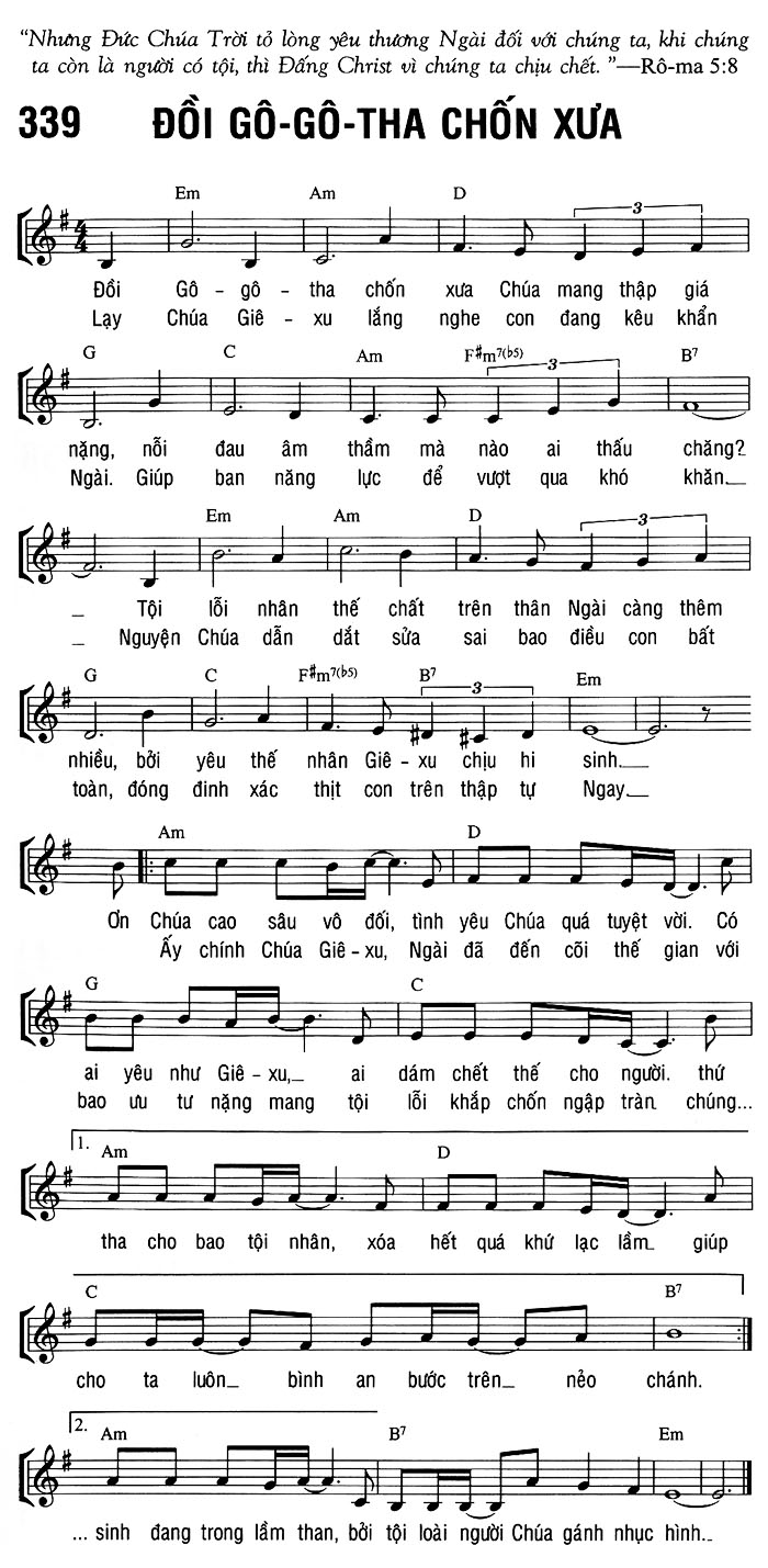1. Đồi Gô-gô-tha chốn xưa Chúa mang thập giá nặng, nỗi đau âm thầm mà nào ai thấu chăng? Tội lỗi nhân thế chất trên thân Ngài càng thêm nhiều, bởi yêu thế nhân Giê-xu chịu hi sinh. Ơn Chúa cao sâu vô đối, tình yêu Chúa quá tuyệt vời. Có ai yêu như Giê-xu, ai dám chết thế cho người. thứ tha cho bao tội nhân, xóa hết quá khứ lạc lầm giúp cho ta luôn bình an bước trên nẻo chánh. 2. Lạy Chúa Giê-xu lắng nghe con đang kêu khẩn Ngài. Giúp ban năng lực để vượt qua khó khăn. Nguyện Chúa dẫn dắt sửa sai bao điều con bất toàn, đóng đinh xác thịt con trên thập tự Ngay. Ấy chính Chúa Giê-xu, Ngài đã đến cõi thế gian với bao ưu tư nặng mang tội lỗi khắp chốn ngập tràn chúng... sinh đang trong lầm than, bởi tội loài người Chúa gánh nhục hình.