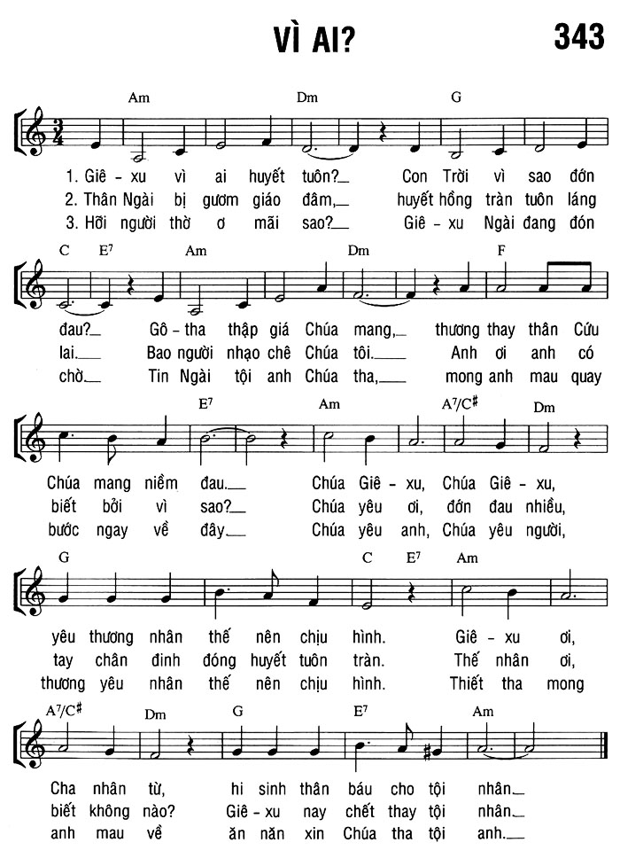 1. Giê - xu vì ai huyết tuôn? Con Trời vì sao đớn đau? Gô - tha thập giá Chúa mang, thương thay thân Cứu Chúa mang niềm đau. Chúa Giê - xu, Chúa Giê - xu, yêu thương nhân thế nên chịu hình. Giê - xu ơi, Cha nhân từ, hi sinh thân báu cho tội nhân. 2. Thân Ngài bị gươm giáo đâm, huyết hồng tràn tuôn láng lai. Bao người nhạo chê Chúa tôi. Anh ơi anh có biết bởi vì sao? Chúa yêu ơi, đớn đau nhiều, tay chân đinh đóng huyết tuôn tràn. Thế nhân ơi, biết không nào? Giê - xu nay chết thay tội nhân. 3. Hỡi người thờ ơ mãi sao? Giê - xu Ngài đang đón chờ. Tin Ngài tội anh Chúa tha, mong anh mau quay Chúa yêu anh, Chúa yêu người, thương yêu nhân thế nên chịu hình. Thiết tha mong anh mau về ăn năn xin Chúa tha tội anh. Điệp khúc: Chúa mang niềm đau. Chúa Giê - xu, Chúa Giê - xu, yêu thương nhân thế nên chịu hình. Giê - xu ơi, Cha nhân từ, hi sinh thân báu cho tội nhân.