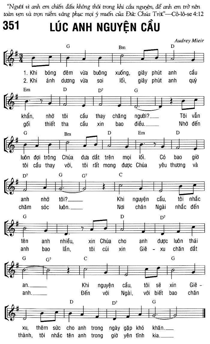 1. Khi bóng đêm vừa buông xuống, giây phút anh cầu khẩn, nhớ tôi cầu thay chăng người? Tôi vẫn luôn đợi trông Chúa đưa dắt trên mọi lối. Có bao giờ anh nhớ tôi? Khi nguyện cầu, tôi nhắc tên anh nhiều, xin Chúa cho anh được luôn thái an. Khi nguyện cầu, tôi sẽ xin Giê-xu, thêm sức cho anh trong ngày gặp khó khăn. 2. Khi ánh dương vừa soi lối, giây phút anh quỳ gối thiết tha cầu xin bao điều. Nhớ đến tôi cầu thay với, tôi rất mong được Chúa yêu thương và chăm sóc luôn. Nơi chân Ngài nhắc đến anh bao lần, tôi cúi xin Giê-xu chăn dắt anh. Đến với Ngài, với biết bao chân thành, tôi nhắc tên anh trong giờ yên tĩnh kia.