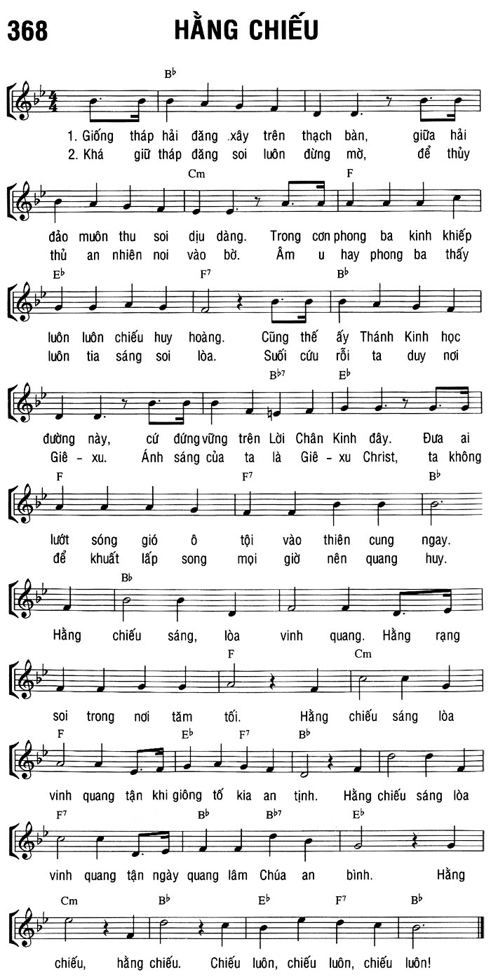 1. Giống tháp hải đăng xây trên thạch bàn, giữa hải đảo muôn thu soi dịu dàng. Trong cơn phong ba kinh khiếp luôn luôn chiếu huy hoàng. Cũng thế ấy Thánh Kinh học đường này, cứ đứng vững trên Lời Chân Kinh đây. Đưa ai lướt sóng gió ô tội vào thiên cung ngay. 2. Khá giữ tháp đăng soi luôn đừng mờ, để thủy thủ an nhiên noi vào bờ. Âm u hay phong ba thấy luôn tia sáng soi lòa. Suối cứu rỗi ta duy nơi Giê-xu. Ánh sáng của ta là Giê-xu Christ, ta không để khuất lấp song mọi giờ nên quang huy. Điệp khúc: Hằng chiếu sáng, lòa vinh quang. Hằng rạng soi trong nơi tăm tối. Hằng chiếu sáng lòa vinh quang tận khi giông tố kia an tịnh. Hằng chiếu sáng lòa vinh quang tận ngày quang lâm Chúa an bình. Hằng chiếu, hằng chiếu. Chiếu luôn, chiếu luôn, chiếu luôn!