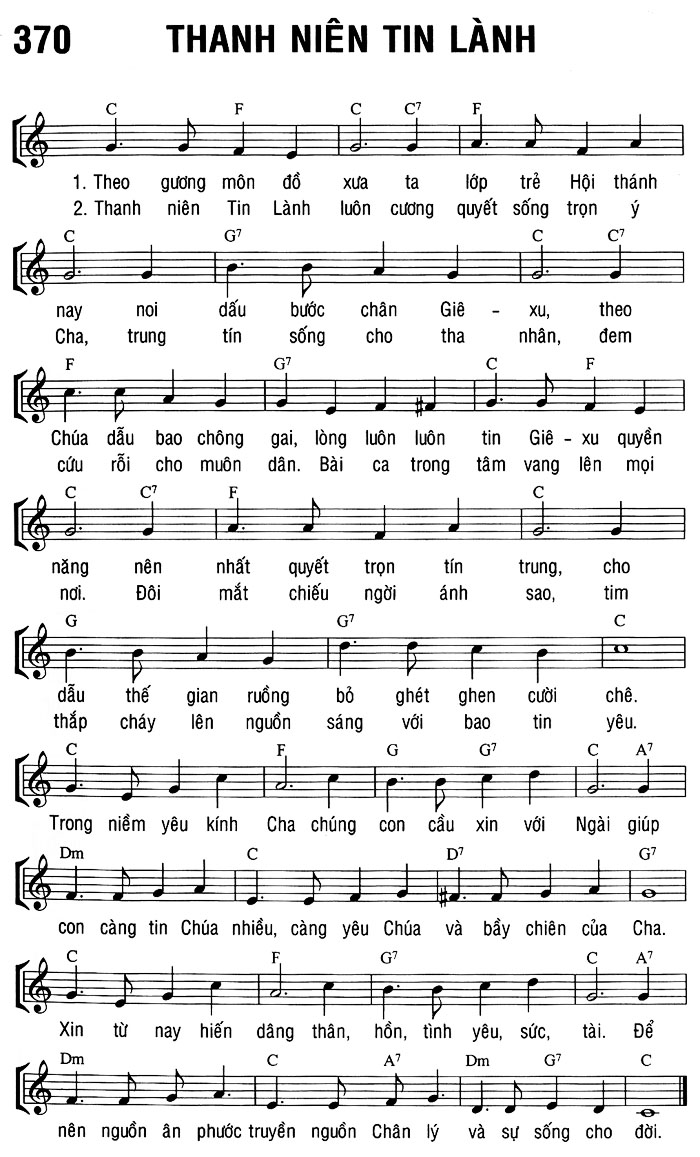 1. Theo gương môn đồ xưa ta lớp trẻ Hội thánh nay noi dấu bước chân Giê-xu, theo Chúa dẫu bao chông gai, lòng luôn luôn tin Giê-xu quyền năng nên nhất quyết trọn tín trung, cho dẫu thế gian ruồng bỏ ghét ghen cười chê. Trong niềm yêu kính Cha chúng con cầu xin với Ngài giúp con càng tin Chúa nhiều, càng yêu Chúa và bầy chiên của Cha. Xin từ nay hiến dâng thân, hồn, tình yêu, sức, tài. Để nên nguồn ân phước truyền nguồn Chân lý và sự sống cho đời. 2. Thanh niên Tin Lành luôn cương quyết sống trọn ý Cha, trung tín sống cho tha nhân, đem cứu rỗi cho muôn dân. Bài ca trong tâm vang lên mọi nơi. Đôi mắt chiếu ngời ánh sao, tìm thắp cháy lên nguồn sáng với bao tin yêu. Trong niềm yêu kính Cha chúng con cầu xin với Ngài giúp con càng tin Chúa nhiều, càng yêu Chúa và bầy chiên của Cha. Xin từ nay hiến dâng thân, hồn, tình yêu, sức, tài. Để nên nguồn ân phước truyền nguồn Chân lý và sự sống cho đời.