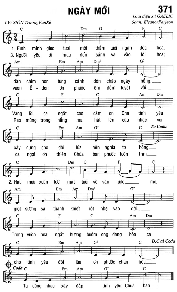 1. Bình minh gieo tươi mới thắm tươi ngàn đóa hoa, đàn chim non tung cánh đón chào ngày hồng. Vang lời ca ngất cao cảm ơn Cha tình yêu xây dựng cho đôi lứa nên nghĩa tơ hồng. 2. Hạt mưa xuân tươi mát tưới vô vàn ước mơ, giọt sương sa thanh khiết rót nhẹ vào đời. Trong vườn hoa ngát hương bướm ong đang hòa ca cho tình yêu đôi lứa ơn phước chan hòa. 3. Người yêu ơi mau đến sánh vai vào lối hoa; vườn Ê-den ơn phước êm đềm tuyệt vời. Reo mừng trong nắng mai hát lên câu nhạc vui ca ngợi ơn thiên Chúa ban phước tuôn tràn. Ta cùng nhau xây đắp tình yêu Chúa ban.