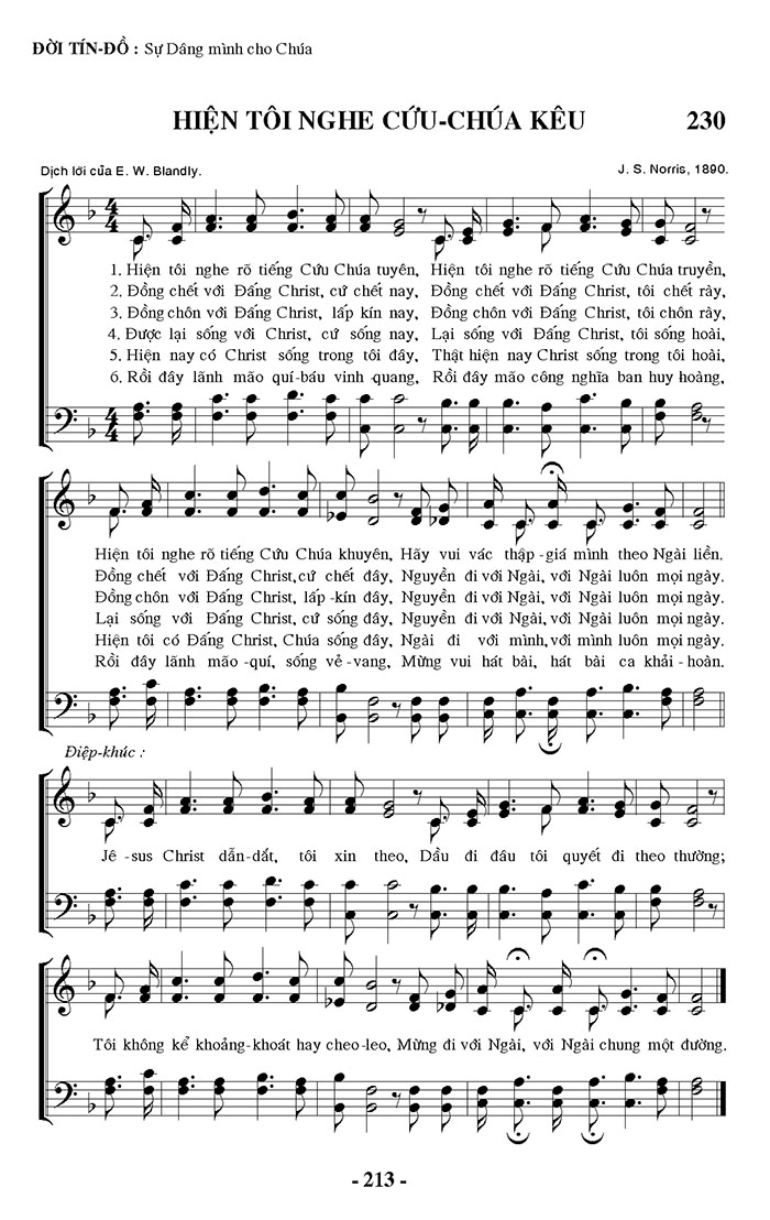 1. Hiện tôi nghe rõ tiếng Cứu Chúa tuyên, Hiện tôi nghe rõ tiếng Cứu Chúa truyền, Hiện tôi nghe rõ tiếng Cứu Chúa khuyên, Hãy vui vác thập giá mình theo Ngài liền, 2. Đồng chết với Đấng Christ, cứ chết nay, Đồng chết với Đấng Christ, tôi chết rày, Đồng chết với Đấng Christ, cứ chết đây, Nguyện đi với Ngài, với Ngài luôn mọi ngày. 3. Đồng chôn với Đấng Christ, lấp kín nay, Đồng chôn với Đấng Christ, tôi chôn rày, Đồng chôn với Đấng Christ, lấp kín đây, Nguyện đi với Ngài, với Ngài luôn mọi ngày. 4. Được lại sống với Christ, cứ sống nay, Lại sống với Đấng Christ, tôi sống hoài, Lại sống với Đấng Christ, cứ sống đây, Nguyện đi với Ngài, với Ngài luôn mọi ngày. 5. Hiện nay có Christ sống trong tôi đây, Thật hiện nay Christ sống trong tôi hoài, Hiện tôi có Đấng Christ, Chúa sống đây, Ngài đi với mình, với mình luôn mọi ngày. 6. Rồi đây lãnh mão quí báu vinh quang. Rồi đây mão công nghĩa ban huy hoàng, Rồi đây lãnh mão quí, sống vẻ vang, Mừng vui hát bài, hát bài ca khải hoàn. Điệp khúc: Jê-sus Christ dẫn dắt, tôi xin theo, Dầu đi đâu tôi quyết đi theo thường; Tôi không kể khoảng-khoát hay cheo-leo, Mừng đi với Ngài, với Ngài chung một đường.
