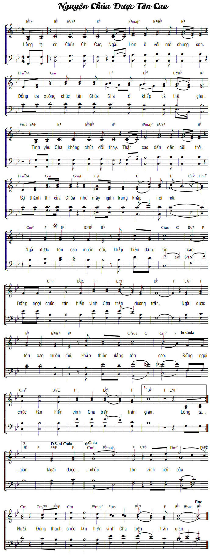 1. Lòng tạ ơn Chúa Chí Cao, Ngài luôn ở với mỗi chúng con. Đồng ca xướng chúc tán Chúa Cha ở khắp cả thế gian. Tình yêu Cha không chút đổi thay. Thật cao đến, đến cõi trời. Sự thành tín của Chúa như mây ngàn trùng khắp nơi nơi. Ngài được tôn cao muôn đời, khắp thiên đàng tôn cao. Đồng ngợi chúc tán hiển vinh Cha trên dương trần. Ngài được tôn cao muôn đời, khắp thiên đàng tôn cao. Đồng ngợi chúc tán hiển vinh Cha trên trần gian. Lòng tạ... 2. gian. Ngài được... ...chúc tôn vinh hiển của Ngài. Đồng thanh chúc tán hiển vinh Cha trên trần gian.
