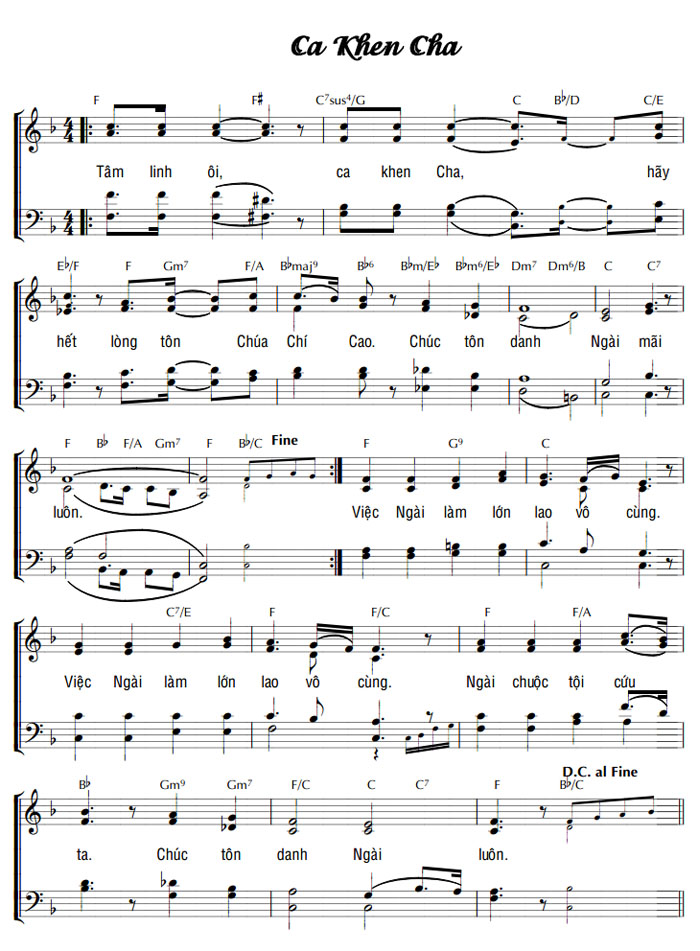 1. Tâm linh ôi, ca khen Cha, hãy hết lòng tôn Chúa Chí Cao. Chúc tôn danh Ngài mãi luôn. Việc Ngài làm lớn lao vô cùng. Việc Ngài làm lớn lao vô cùng. Ngài chuộc tội cứu ta. Chúc tôn danh Ngài luôn.