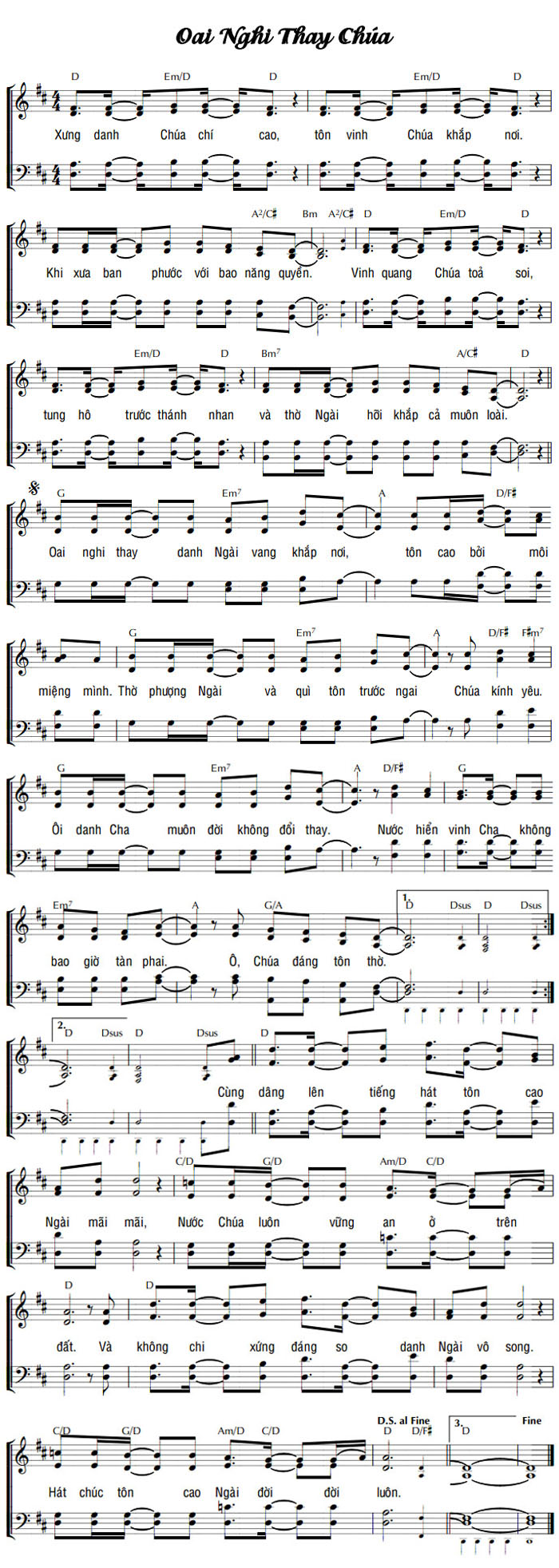 1. Xưng danh Chúa chí cao, tôn vinh Chúa khắp nơi. Khi xưa ban phước với bao năng quyền. Vinh quang Chúa toả soi, tung hô trước thánh nhan và thờ Ngài hồi khắp cả muôn loài. Oai nghi thay danh Ngài vang khắp nơi, tôn cao bởi môi miệng mình. Thờ phượng Ngài và quì tôn trước ngai Chúa kính yêu. Ôi danh Cha muôn đời không đổi thay. Nước hiển vinh Cha không bao giờ tàn phai. Ô, Chúa đáng tôn thờ. Cùng dâng lên tiếng hát tôn cao Ngài mãi mãi, Nước Chúa luôn vững an ở trên đất. Và không chi xứng đáng so danh Ngài vô song. Hát chúc tôn cao Ngài đời đời luôn. 2. Xưng danh Chúa chí cao, tôn vinh Chúa khắp nơi. Khi xưa ban phước với bao năng quyền. Vinh quang Chúa toả soi, tung hô trước thánh nhan và thờ Ngài hồi khắp cả muôn loài. Oai nghi thay danh Ngài vang khắp nơi, tôn cao bởi môi miệng mình. Thờ phượng Ngài và quì tôn trước ngai Chúa kính yêu. Ôi danh Cha muôn đời không đổi thay. Nước hiển vinh Cha không bao giờ tàn phai. Ô, Chúa đáng tôn thờ. Cùng dâng lên tiếng hát tôn cao Ngài mãi mãi, Nước Chúa luôn vững an ở trên đất. Và không chi xứng đáng so danh Ngài vô song. Hát chúc tôn cao Ngài đời đời luôn. 3. Xưng danh Chúa chí cao, tôn vinh Chúa khắp nơi. Khi xưa ban phước với bao năng quyền. Vinh quang Chúa toả soi, tung hô trước thánh nhan và thờ Ngài hồi khắp cả muôn loài. Oai nghi thay danh Ngài vang khắp nơi, tôn cao bởi môi miệng mình. Thờ phượng Ngài và quì tôn trước ngai Chúa kính yêu. Ôi danh Cha muôn đời không đổi thay. Nước hiển vinh Cha không bao giờ tàn phai. Ô, Chúa đáng tôn thờ. Cùng dâng lên tiếng hát tôn cao Ngài mãi mãi, Nước Chúa luôn vững an ở trên đất. Và không chi xứng đáng so danh Ngài vô song. Hát chúc tôn cao Ngài đời đời luôn.