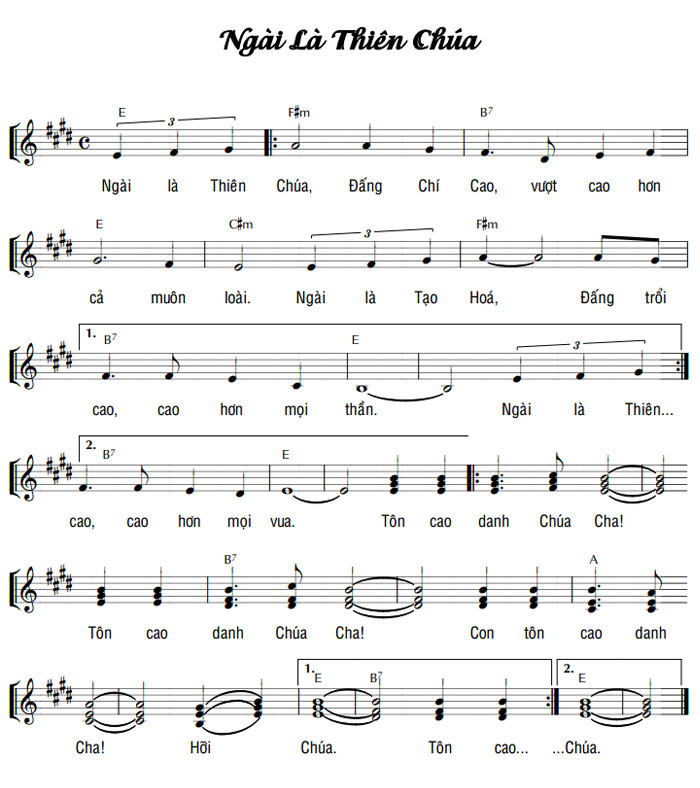 1. Ngài là Thiên Chúa, Đấng Chí Cao, vượt cao hơn cả muôn loài. Ngài là Tạo Hoá, Đấng trổi cao, cao hơn mọi thần. Ngài là Thiên... Cha! Hồi Chúa. Tôn cao... ...Chúa. 2. Ngài là Thiên Chúa, Đấng Chí Cao, vượt cao hơn cả muôn loài. Ngài là Tạo Hoá, Đấng trổi cao, cao hơn mọi vua. Tôn cao danh Chúa Cha! Con tôn cao danh Chúa. Điệp khúc: Tôn cao danh Chúa Cha! Con tôn cao danh Chúa.