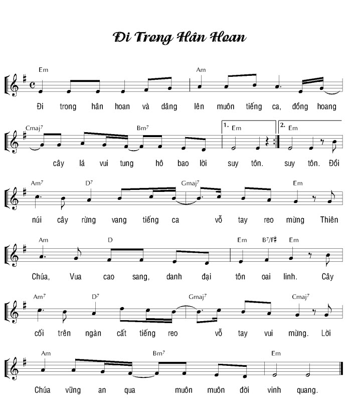 1. Đi trong hân hoan và dâng lên muôn tiếng ca, đồng hoang cây lá vui tung hô bao lời suy tôn. suy tôn. Đồi núi cây rừng vang tiếng ca vỗ tay reo mừng Thiên Chúa, Vua cao sang, danh đại tôn oai linh. Cây cối trên ngàn cất tiếng reo vỗ tay vui mừng. Lời Chúa vững an qua muôn muôn đời vinh quang.