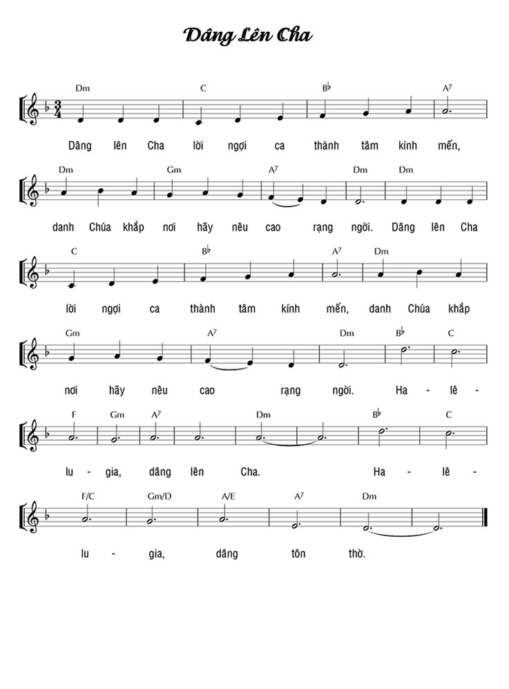 1. Dâng lên Cha lời ngợi ca thành tâm kính mến, danh Chúa khắp nơi hãy nêu cao rạng ngời. Dâng lên Cha lời ngợi ca thành tâm kính mến, danh Chúa khắp nơi hãy nêu cao rạng ngời. Ha-lê-lu-gia, dâng lên Cha. Ha-lê-lu-gia, dâng tôn thờ.