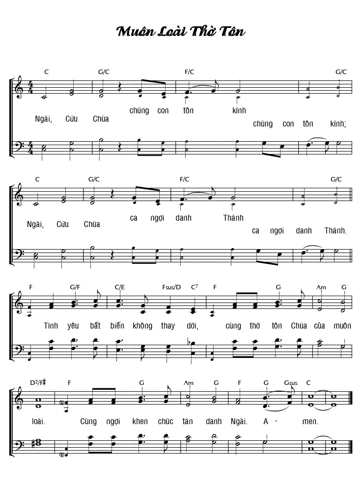 Điệp khúc: Ngài, Cứu Chúa chúng con tôn kính; Ngài, Cứu Chúa ca ngợi danh Thánh. Tình yêu bất biến không thay đổi, cùng thờ tôn Chúa của muôn loài. Cùng ngợi khen chúc tán danh Ngài. A-men.