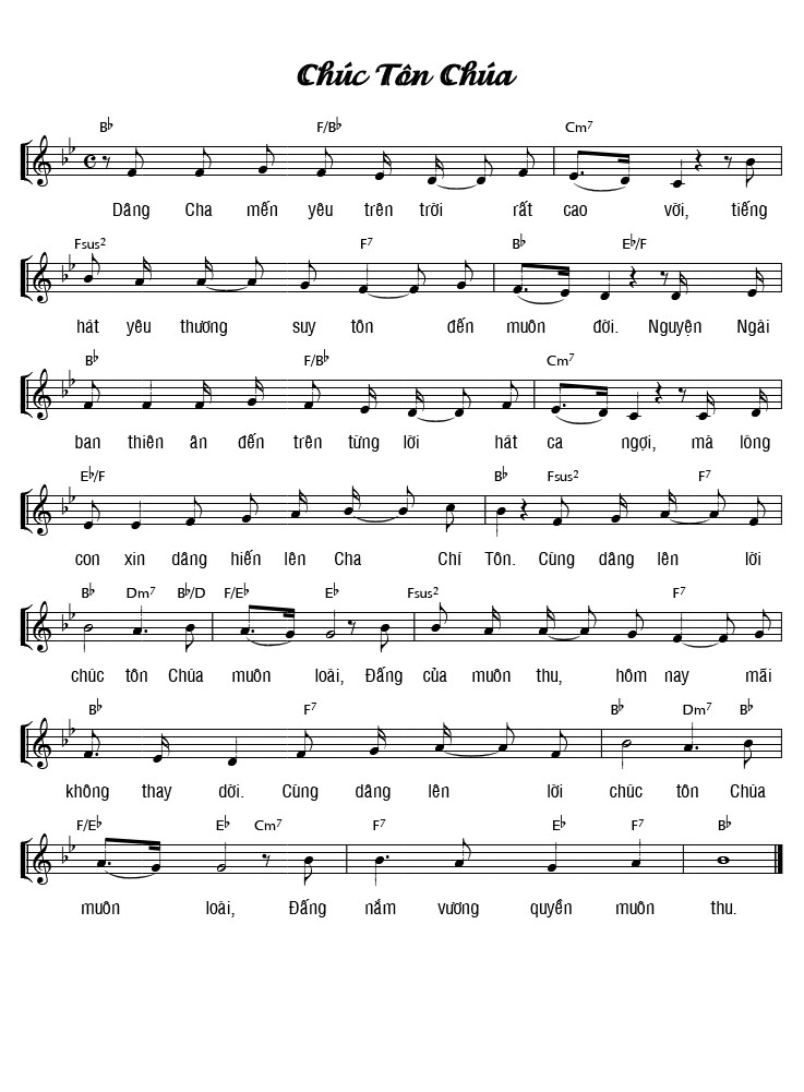 1. Dâng Cha mến yêu trên trời rất cao với, tiếng hát yêu thương suy tôn đến muôn đời. Nguyện Ngài ban thiên ân đến trên từng lời hát ca ngợi, mà lòng con xin dâng hiến lên Cha Chí Tôn. Cũng dâng lên lời chúc tôn Chúa muôn loài, Đấng của muôn thu, hôm nay mãi không thay dời. Cũng dâng lên lời chúc tôn Chúa muôn loài, Đấng nắm vương quyền muôn thu.