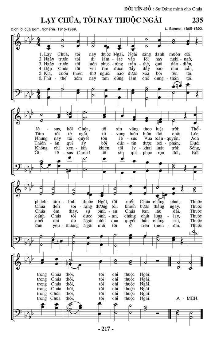 1. Lạy Chúa, tôi nay thuộc Ngài, Ngài sáng danh muôn đời, Jê-sus, hỡi Chúa, tôi xin vâng theo luật trời; Thể phách, tâm linh thuộc Ngài, tôi mến Chúa chẳng phai, Thuộc trong Chúa thôi, tôi chỉ thuộc Ngài. 2. Ngày trước tôi đi lầm lạc vào lối hay nghi ngờ, Tâm tôi tẻ ngắt, tử vong luôn luôn đợi chờ; Chúa đến soi rạng đường tôi, khiến bước thẳng ngay, Thuộc trong Chúa thôi, tôi chỉ thuộc Ngài. 3. Ngày trước tôi luôn phục tùng trần thế, quá đảo - điên, Nhưng nay tôi quyết tôn Jê-sus Vua toàn - quyền; Chúa êm thay, sự bình an Chúa ban lâu dài, Thuộc trong Chúa thôi, tôi chỉ thuộc Ngài. 4. Gặp Chúa tôi vui tìm được đầy dẫy bao nhu cần, Thiên ân quí ấy bởi đức tin được bội phần; Cánh Chúa tôi được bình an, chẳng chút lung lay, Thuộc trong Chúa thôi, tôi chỉ thuộc Ngài. 5. Kìa, cuốn thiên thơ người nào được xóa - bôi tên tôi, Không chi xen lẫn khiến tôi ly - khai luật trời; Chết chỉ do Ngài nhìn qua quyết hẳn chẳng sai, Thuộc trong Chúa thôi, tôi chỉ thuộc Ngài. 6. Phù thế hôm nay tạm dùng làm chỗ dung thân tôi, Ôi, Jê-sus Christ! tôi xin qui - phục trọn đời; Đức yêu - thương Ngài mời tôi ở trên thiên đài, Thuộc trong Chúa thôi, tôi chỉ thuộc Ngài. Outro: A - MEN.