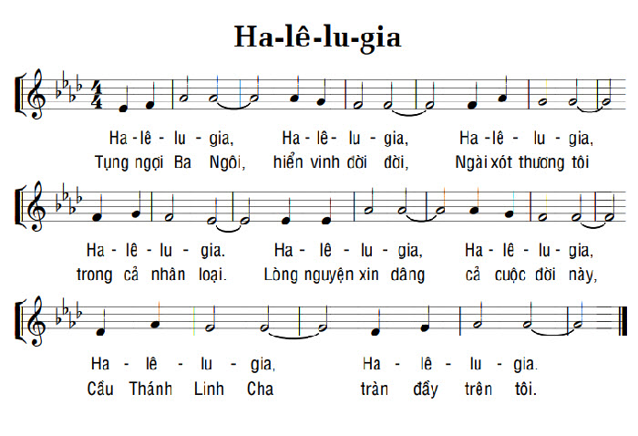 1. Ha-lê-lu-gia, Ha-lê-lu-gia, Ha-lê-lu-gia, Tụng ngợi Ba Ngôi, hiển vinh đời đời, Ngài xót thương tôi. 2. Ha-lê-lu-gia, Ha-lê-lu-gia, Ha-lê-lu-gia, trong cả nhân loại. Lòng nguyện xin dâng cả cuộc đời này. 3. Ha-lê-lu-gia, Ha-lê-lu-gia. Cầu Thánh Linh Cha tràn đầy trên tôi.
